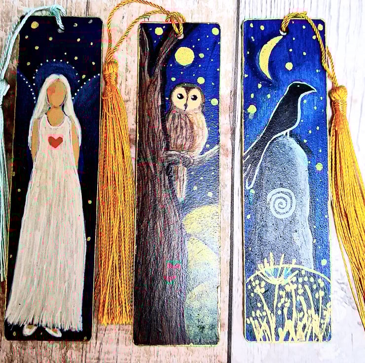 A lovely mystical gift for book lovers, artist quality paints, matt varnish to protect the artwork and all finished with a pretty silk effect pale blue tassel.