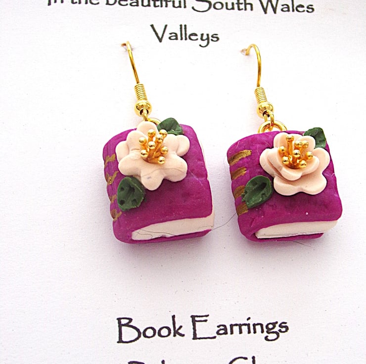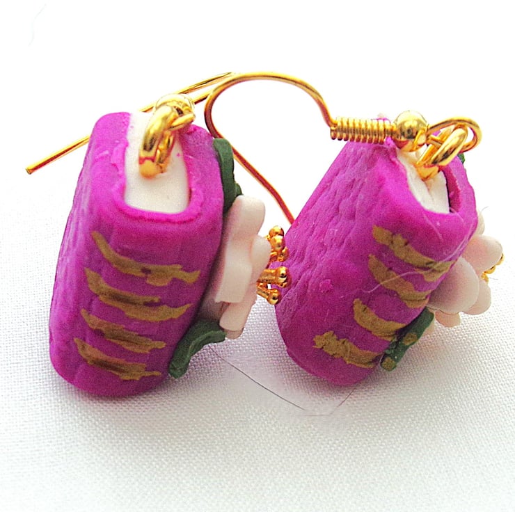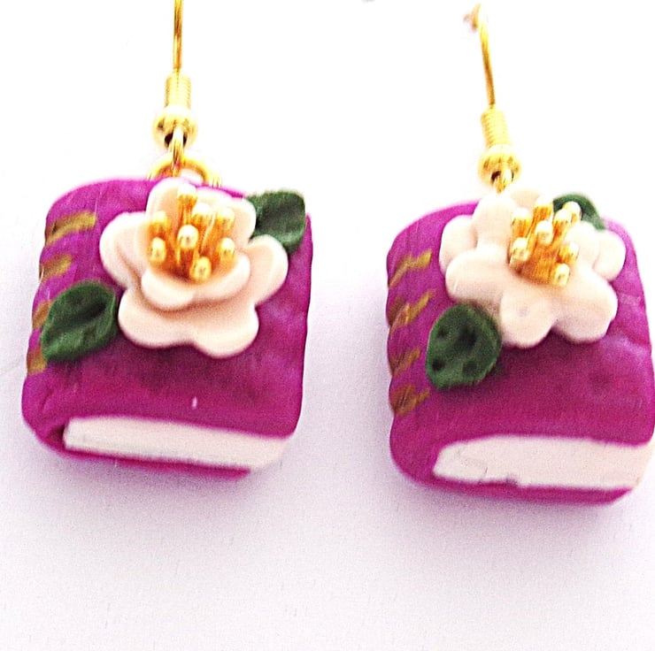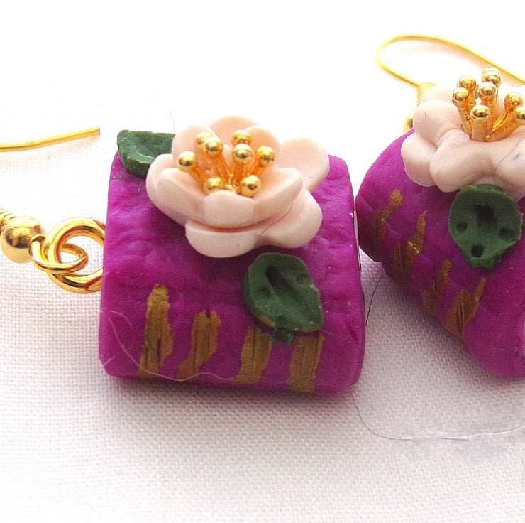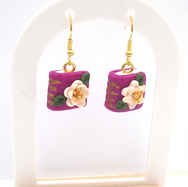 A cute ,fun and unique pair of earrings that I have handcrafted from polymer clay in a rich shade of purple. I have decorated the front of these earrings with white flowers and gold plated centres.