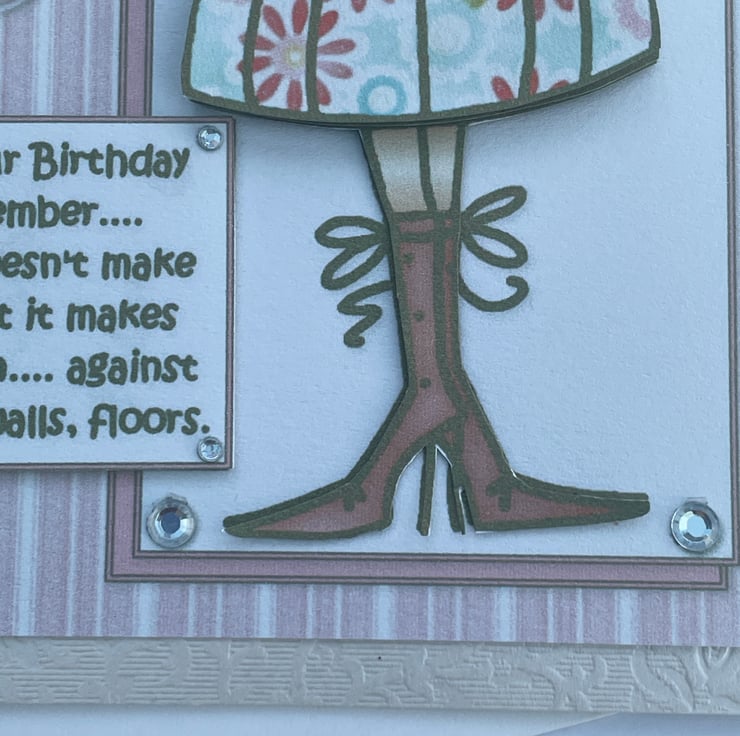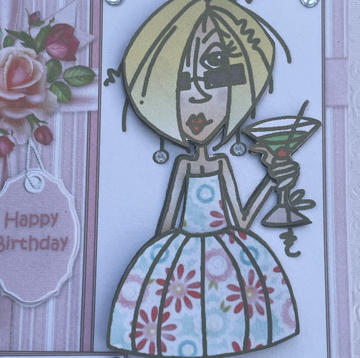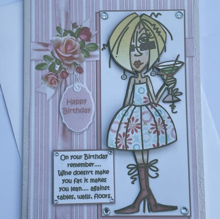 This card is for the wine lover who loves a giggle! This A5 card has an embossed luxury brocade pearl finish. This is topped with a pale pink striped background paper. This has a decoupaged (layered) lady with a glass in her hand. She is all set for a night out. There is a printed ribbon with a rose cluster. There are 2 greetings on this card. One says a simple Happy Birthday, the other says On your birthday remember...wine doesn't make you fat it makes you lean....against tables, walls, floors! Very amusing for your drinking friend!