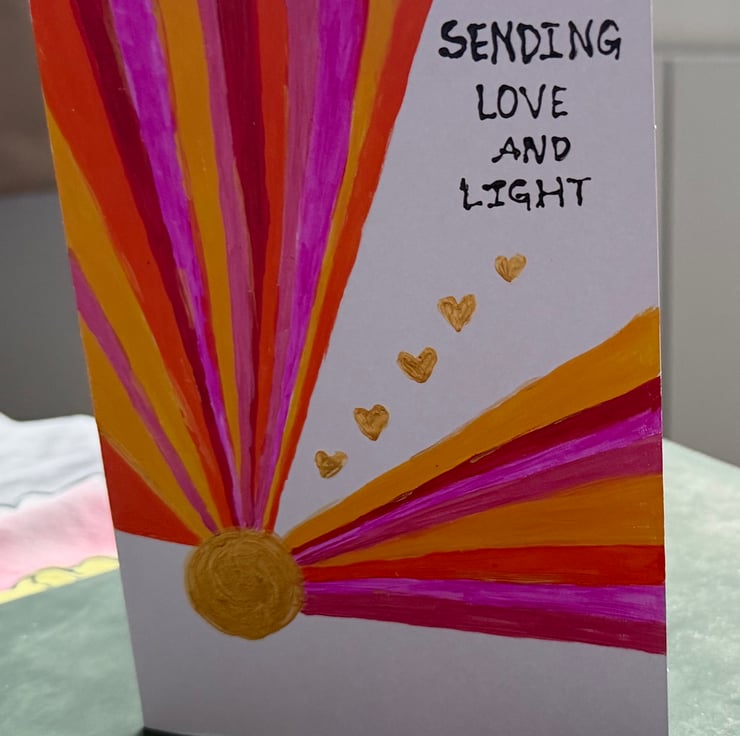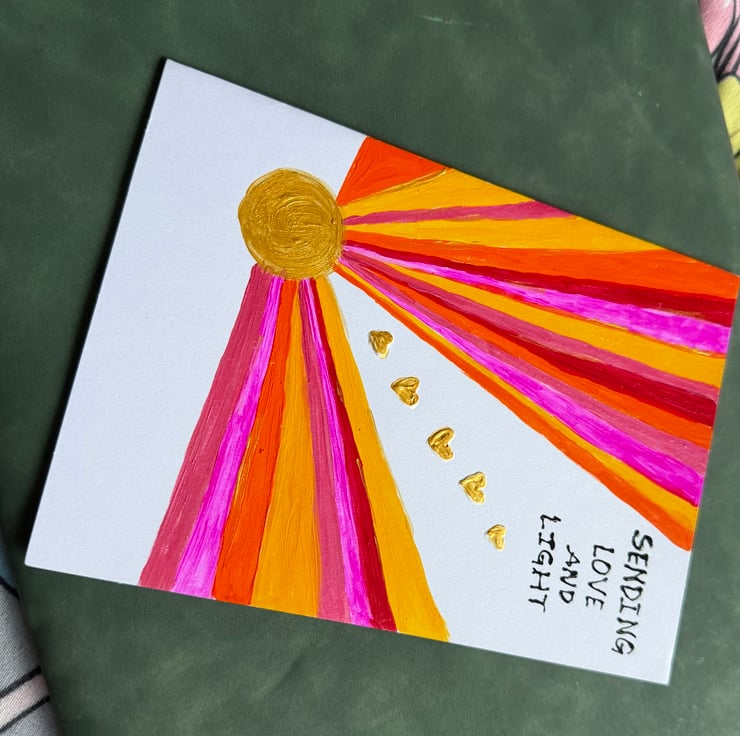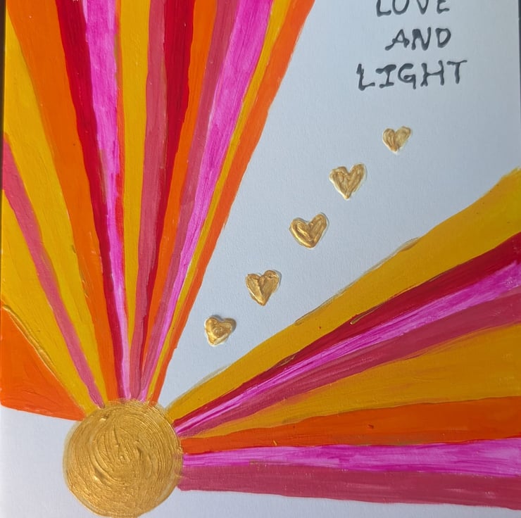 The design features warm pink, orange and yellow tones with gold-painted details and the message “Sending Love and Light” on the front.