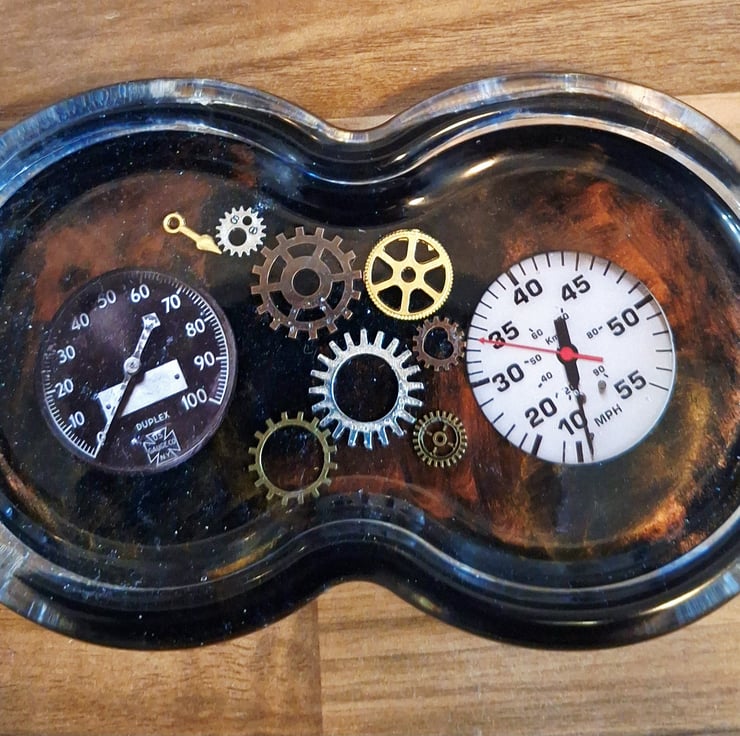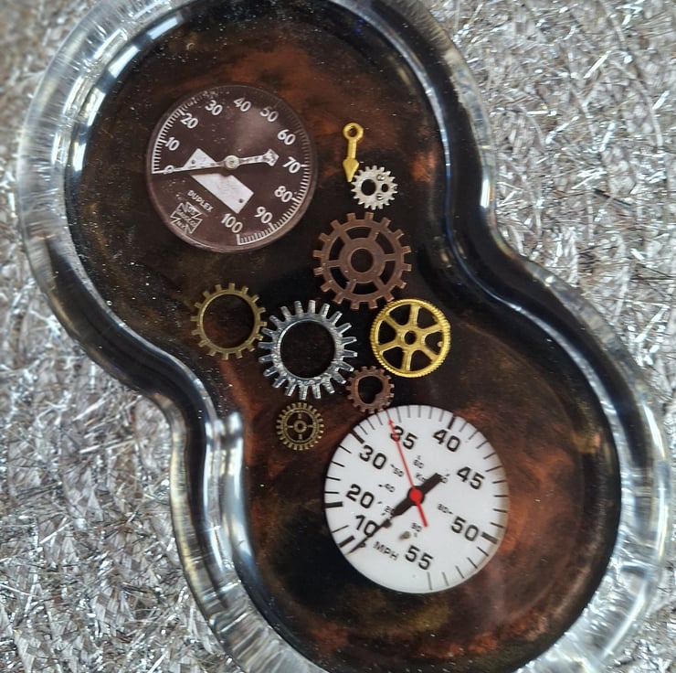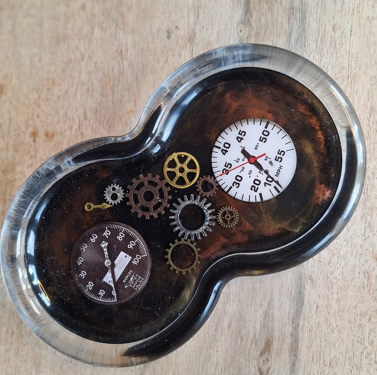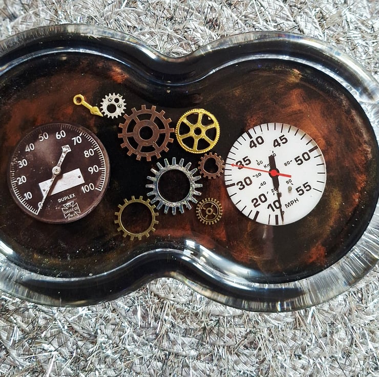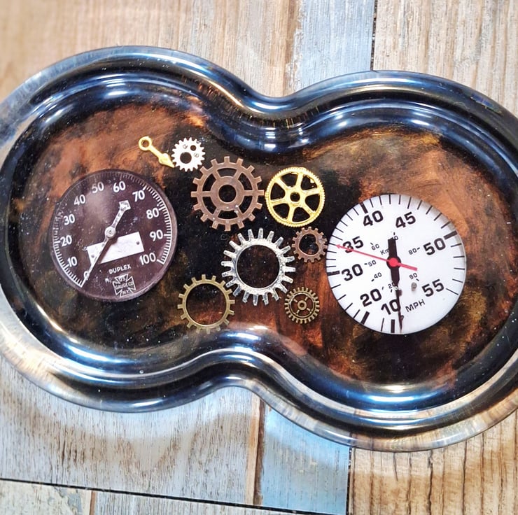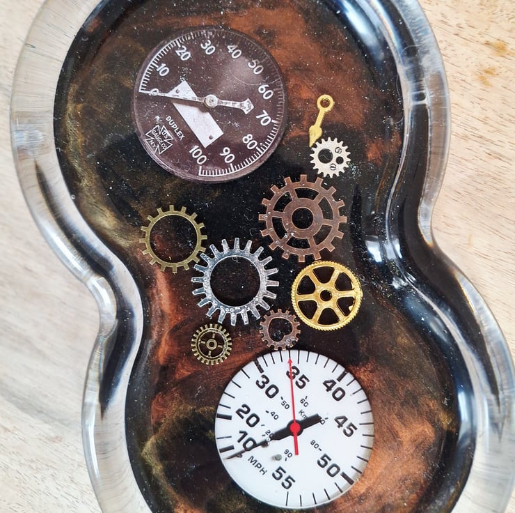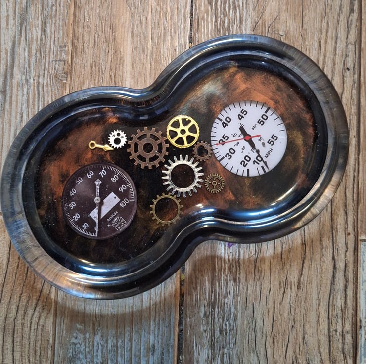 A classy tray decorated with an assortment of cogs, gears & dials.