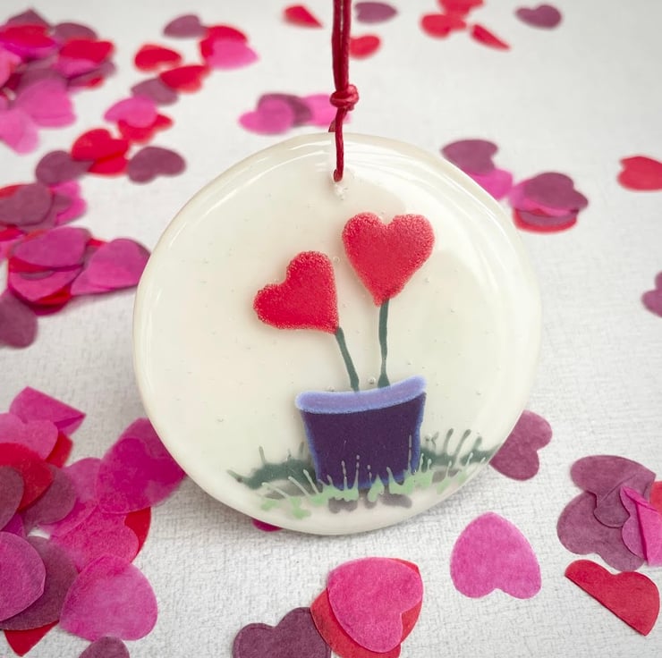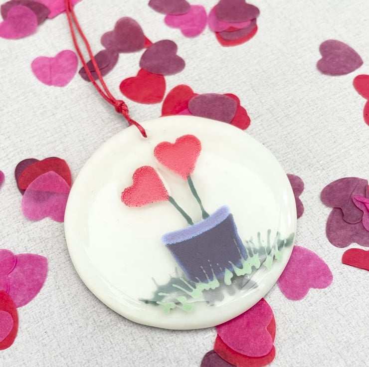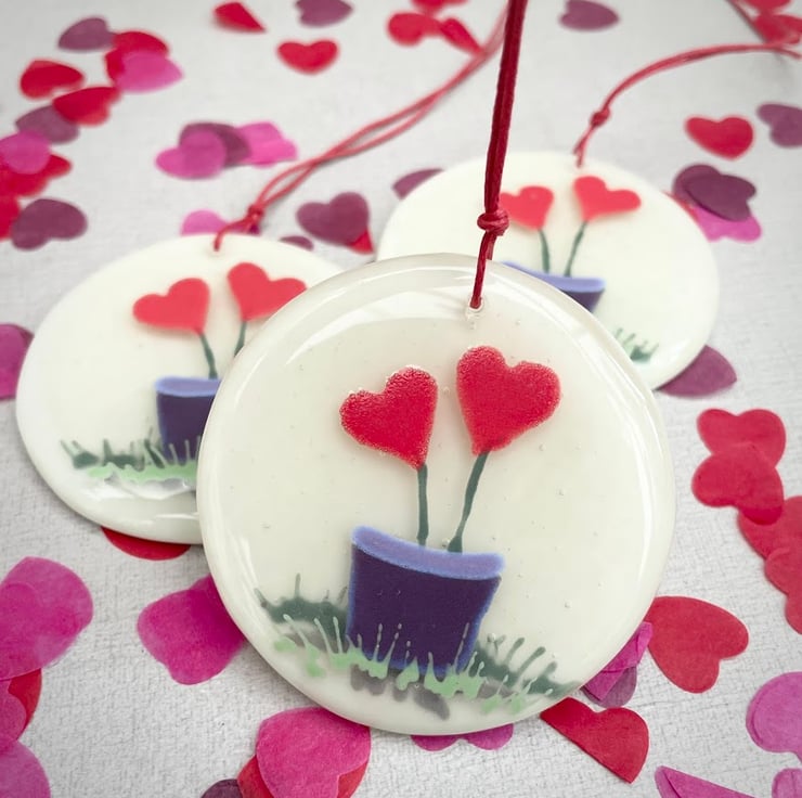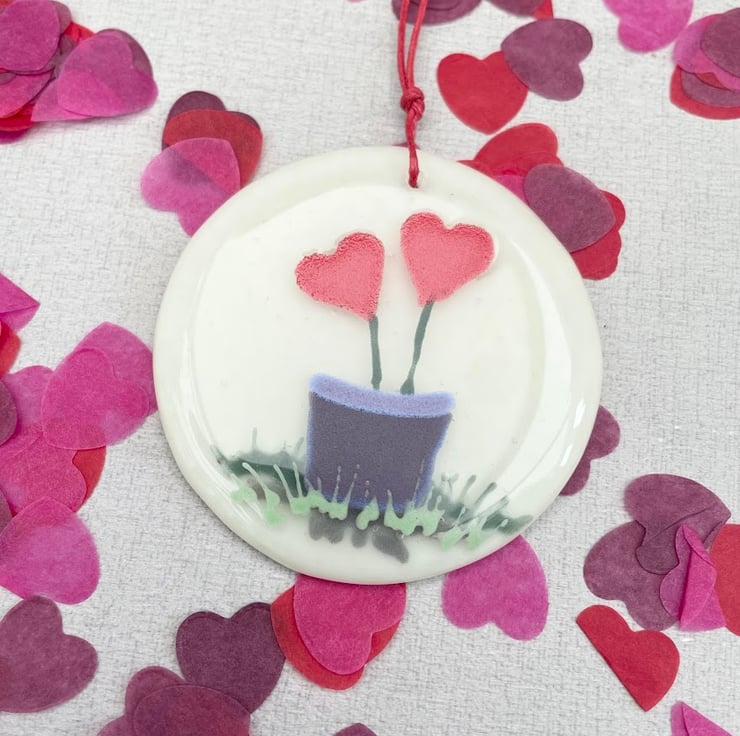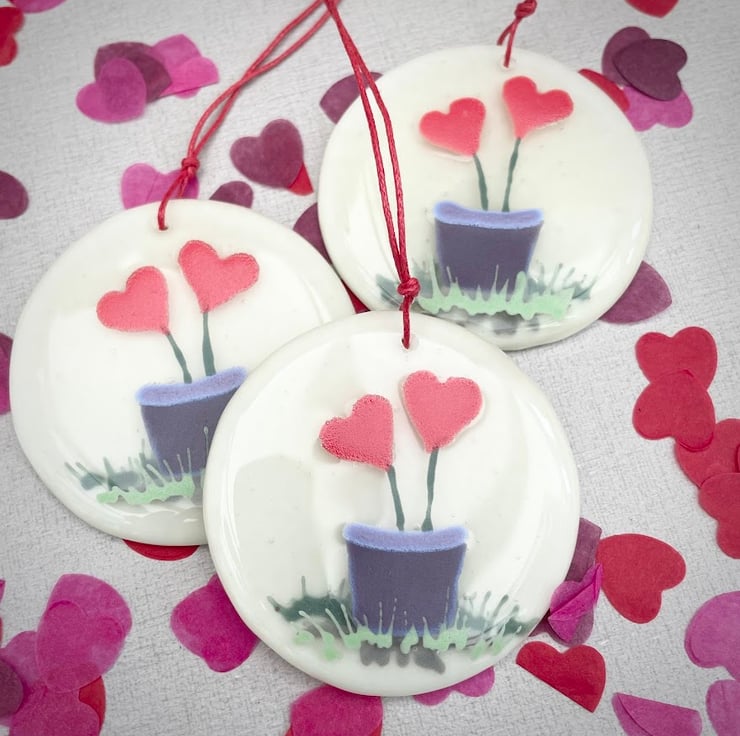 Let your love grow with these two hearts set in a purple flower pot Round decorations that would make lovely little Valentines gifts to your someone special.