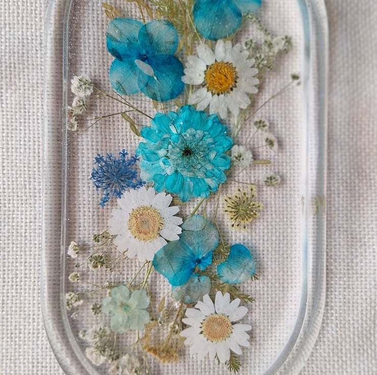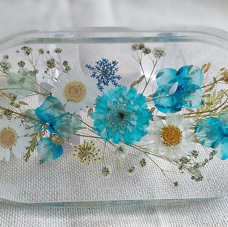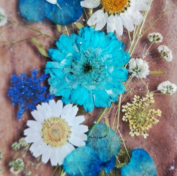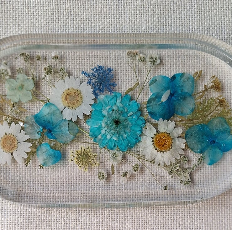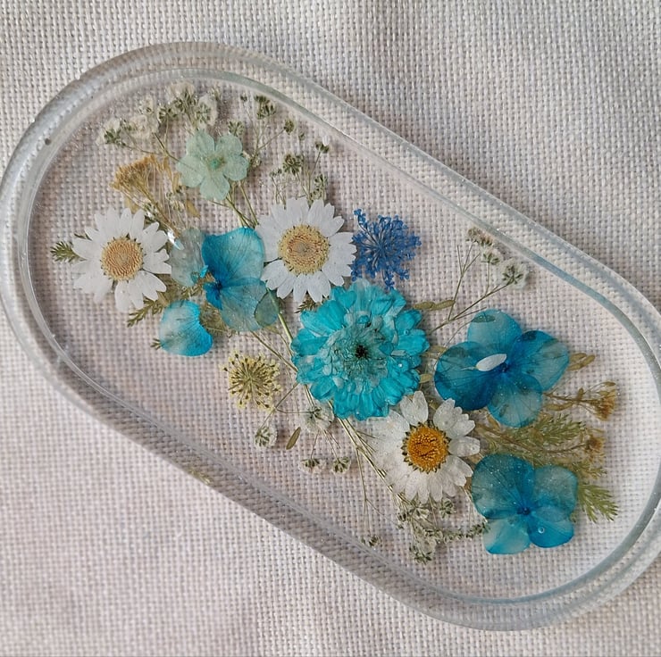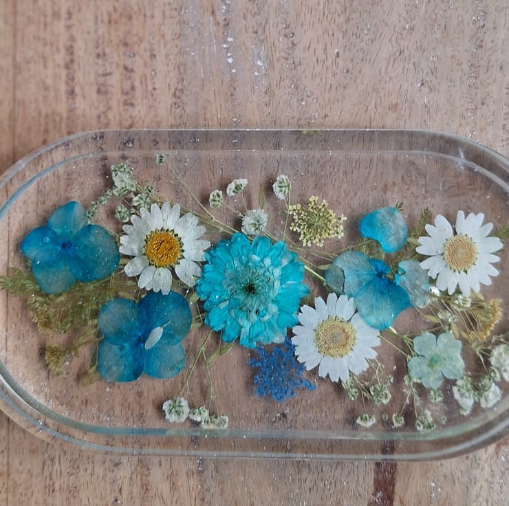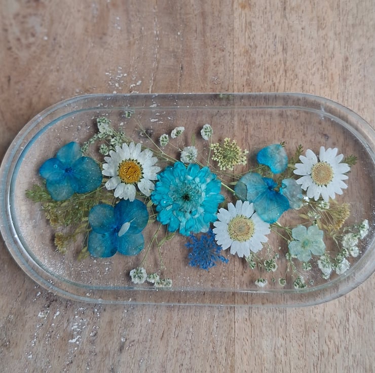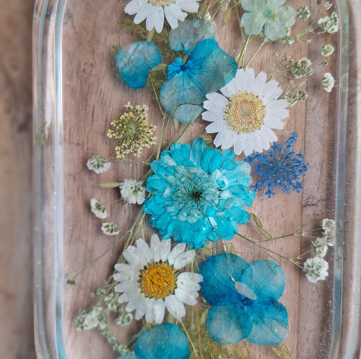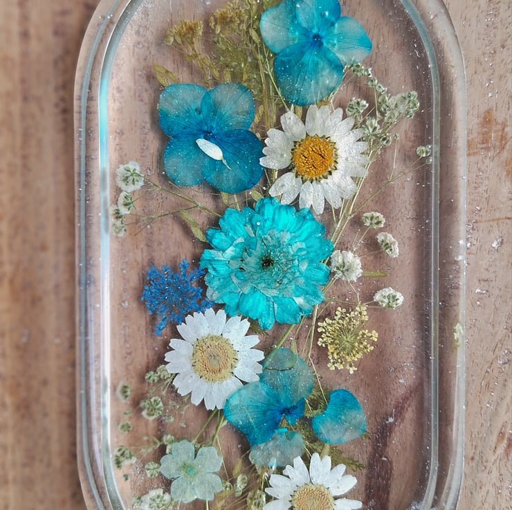 A beautiful floral tray, decorated with a mix of real pressed flowers, daisies, gypsophila & fern leaves. Ideal to display in your home, office or studio. A lovely gift for any occasion.
