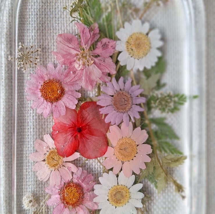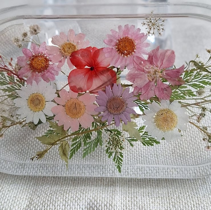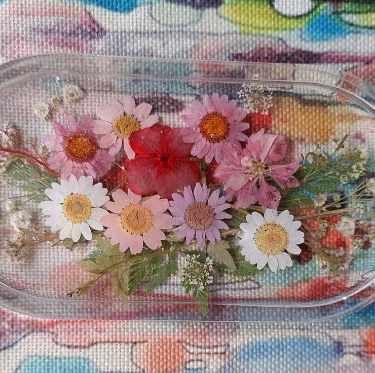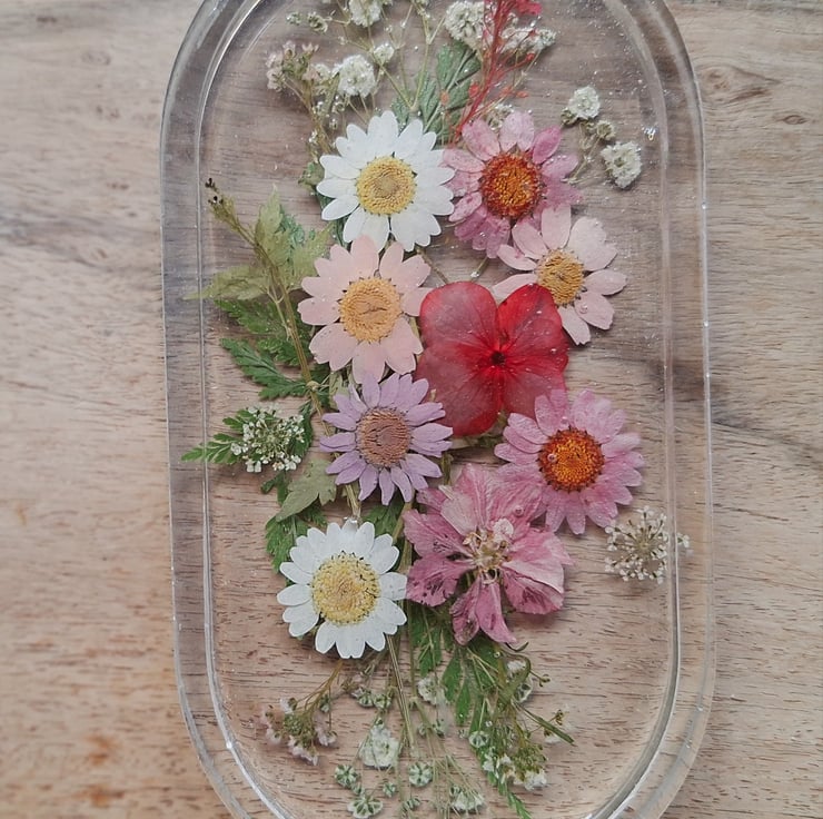 A pretty floral oval tray. Handmade with resin & decorated with a mix of real pressed flowers, daisies, gypsophila & fern. Ideal for trinkets, bits n Bobs, makeup brushes, glasses etc or a favourite drink & nibbles. A perfect gift for any occassion.