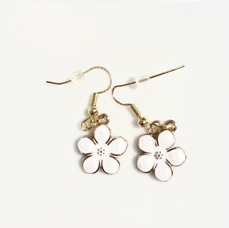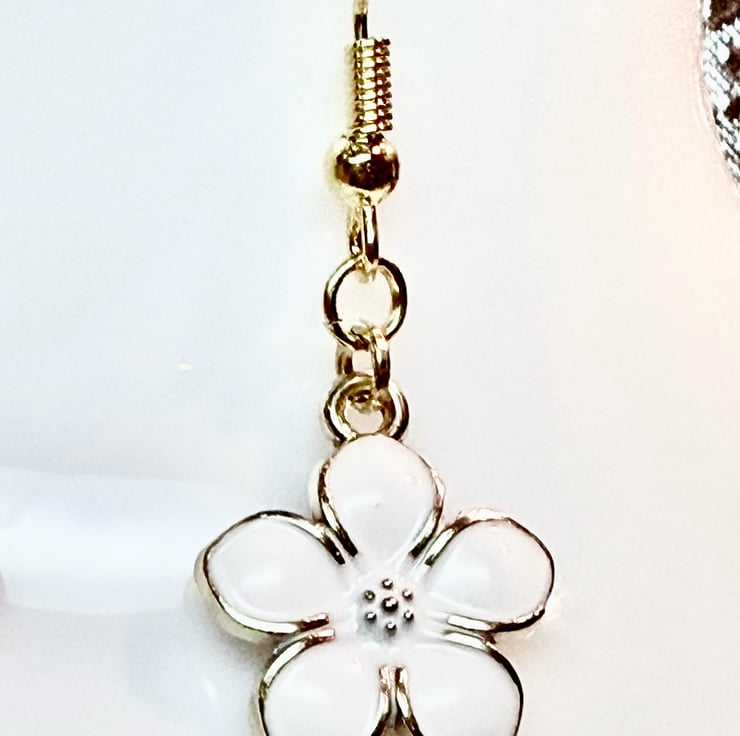 Dangle earrings with white pendant flower with gold details. Earring hooks are 14K gold-plated and non-fading.