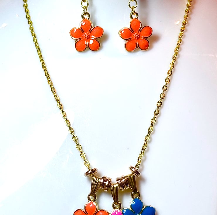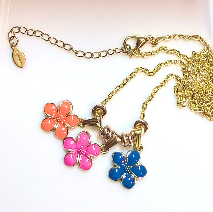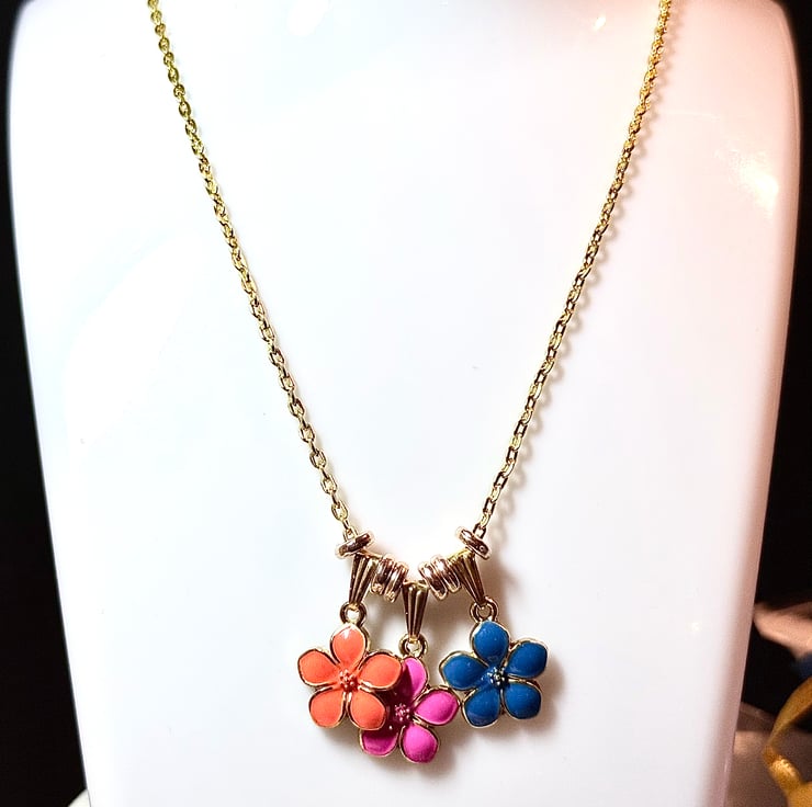 Gold chain necklace with three flower pendants. Flowers are orange, pink and blue with gold details on each.