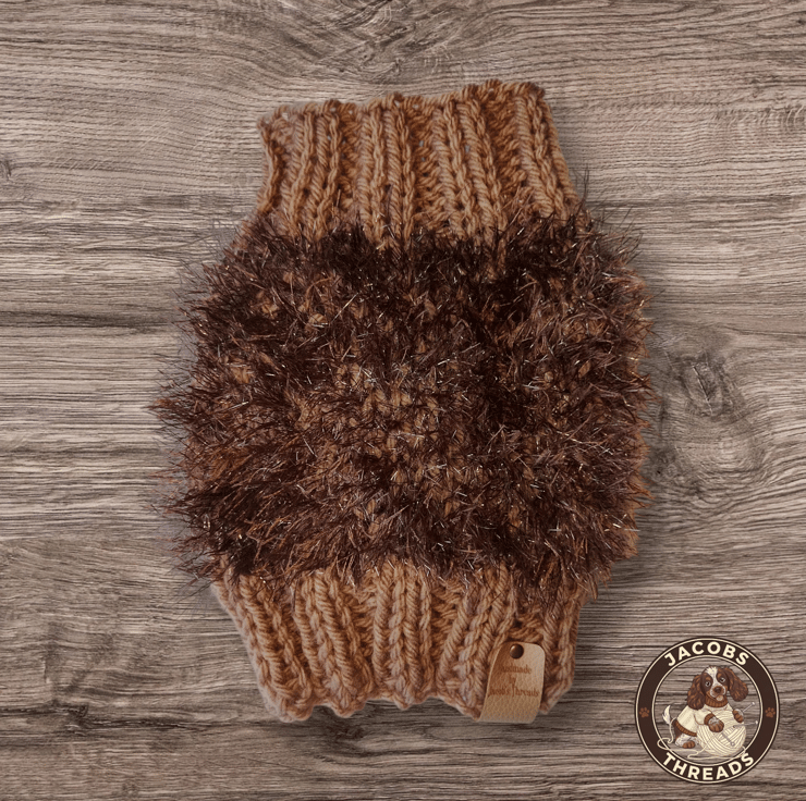 A cosy, hand-knitted chunky snood in warm chocolate with a soft beige fleck and subtle tinsel sparkle. Knitted with stretchy rib, this snood is long and narrow, making it especially flattering for dogs with longer necks such as whippets, greyhounds or lurchers — but it will also comfortably fit many small to medium dogs because of its stretch.