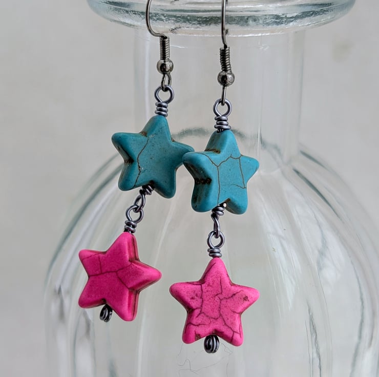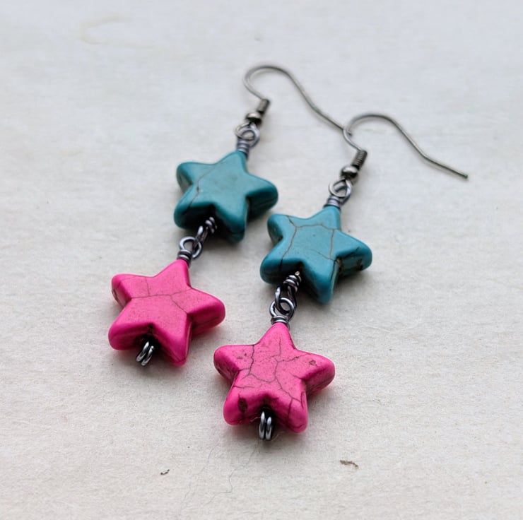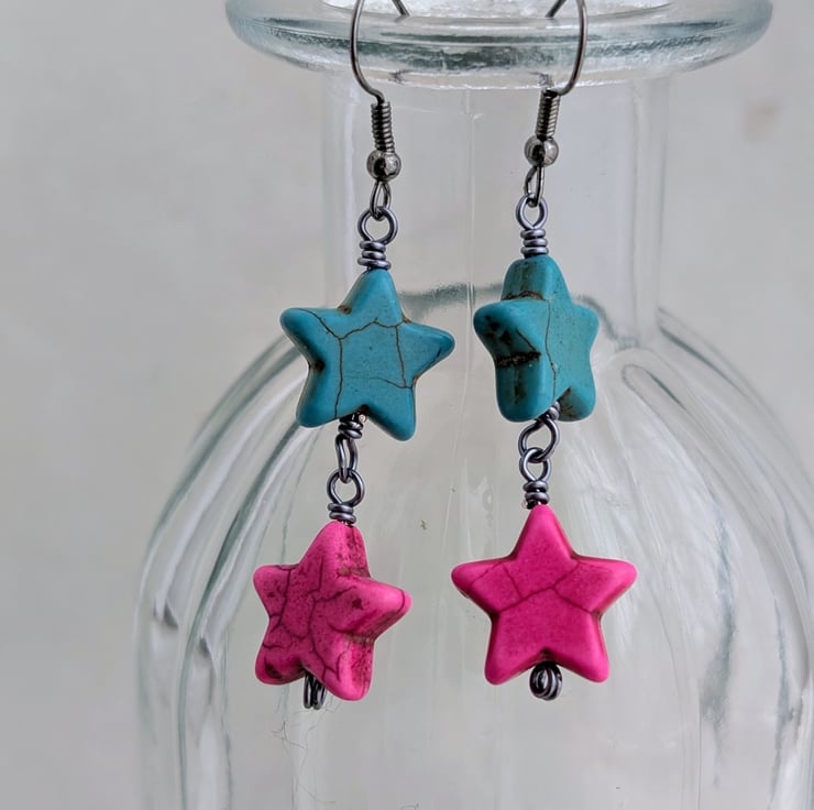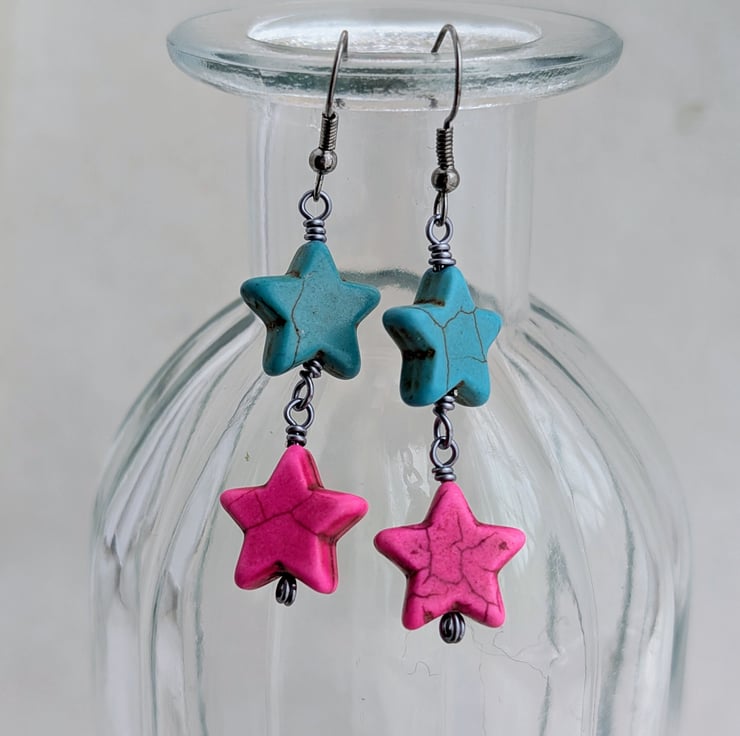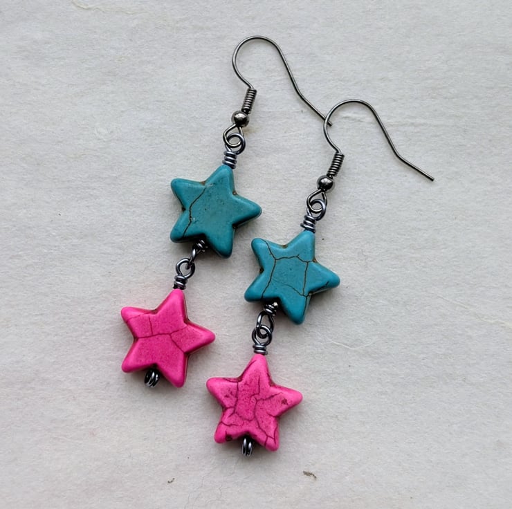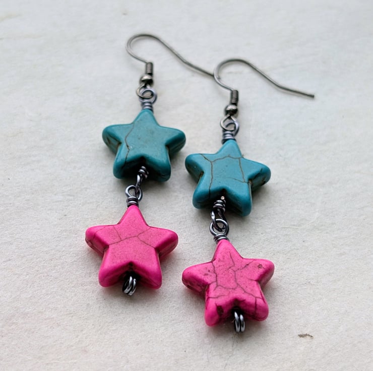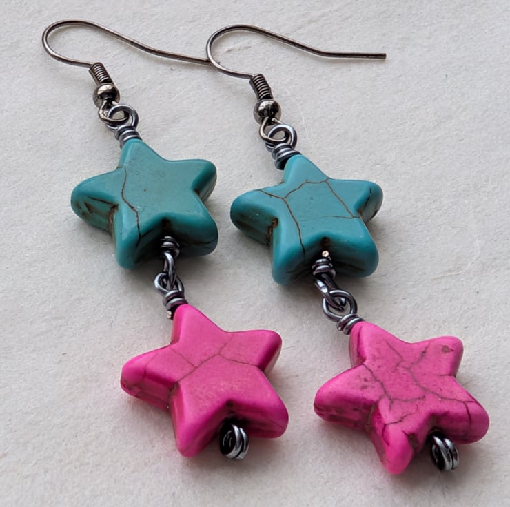 These colourful earrings feature chunky howlite stars in vibrant turquoise and hot pink stars. They've been attached together with gunmetal wire and they hang from gunmetal ear wires. They have a drop of 1.5 inches and are wonderfully swingy.