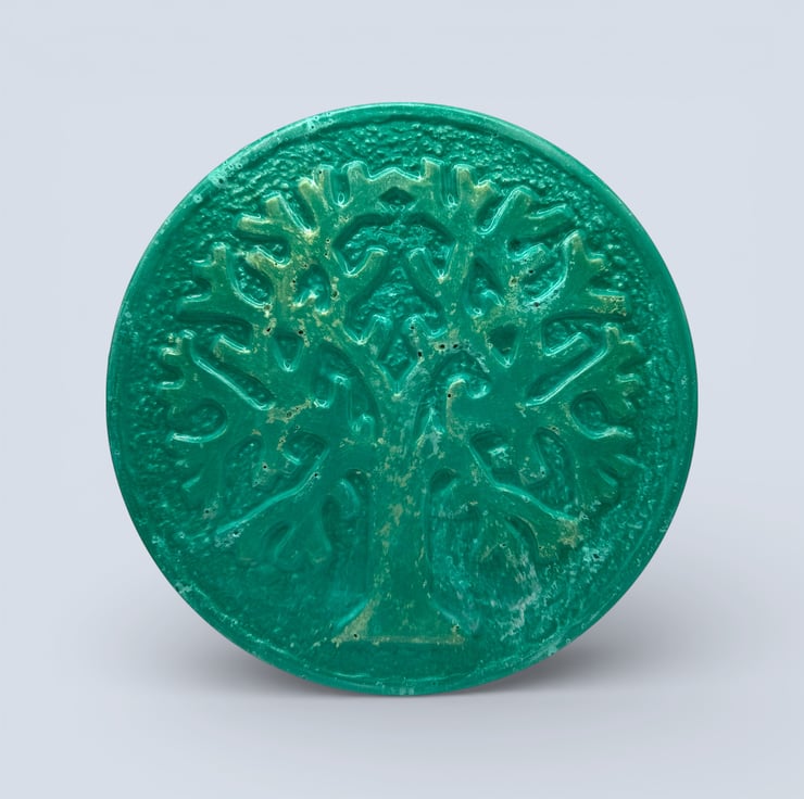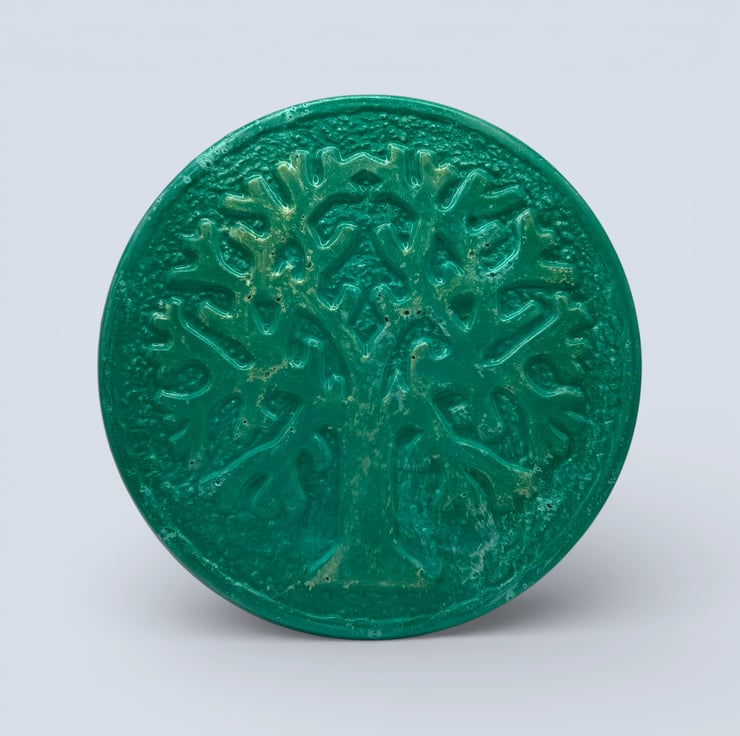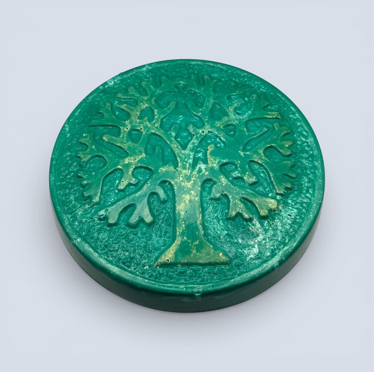 This round decorative plaque features a raised Tree of Life design set into a rich emerald green background, with lighter green and soft gold-toned highlights created using mica. The mica adds a subtle shimmer that catches the light across the textured surface, giving the piece depth and visual interest.