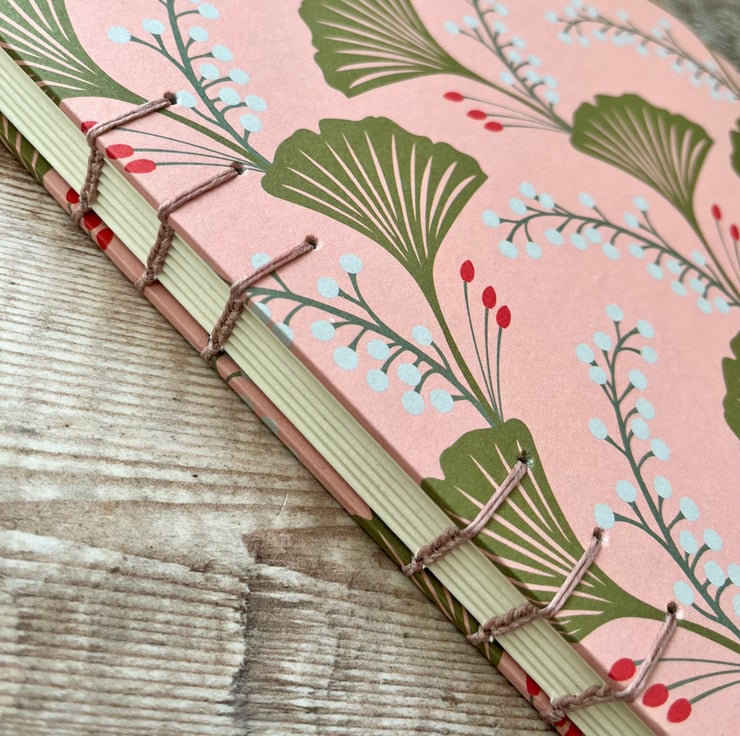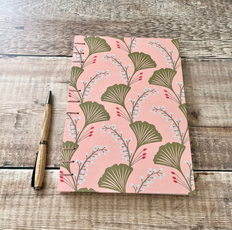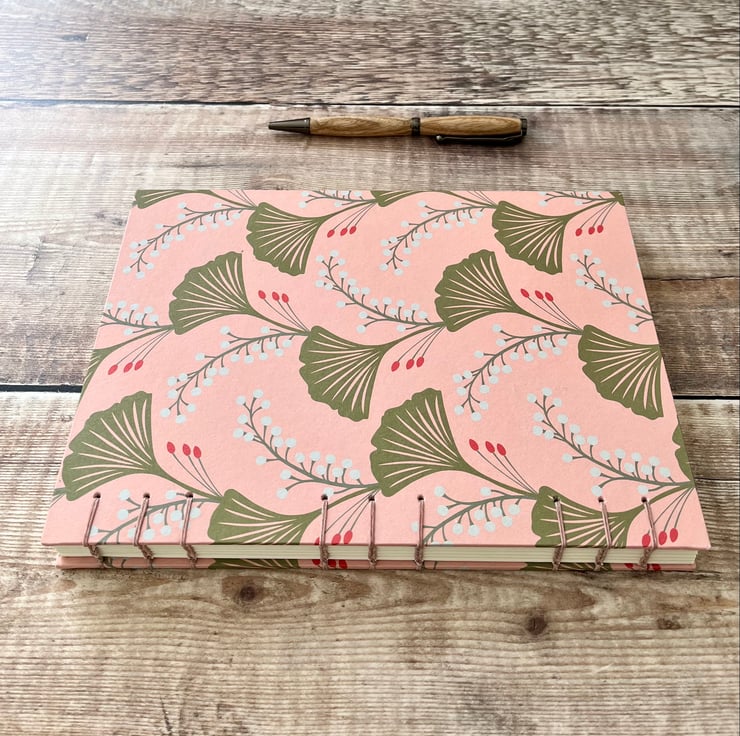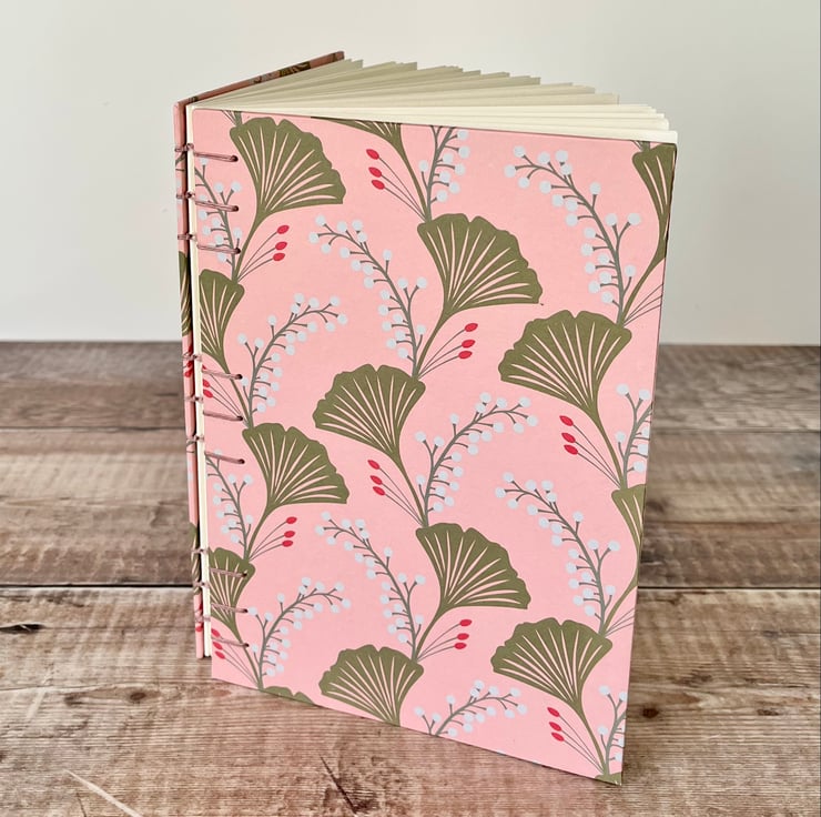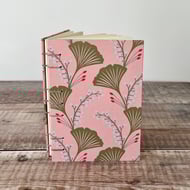 This A5 journal sketchbook is covered with a contemporary paper featuring Ginkgo leaves on a pink background and bound using Coptic Stitch.