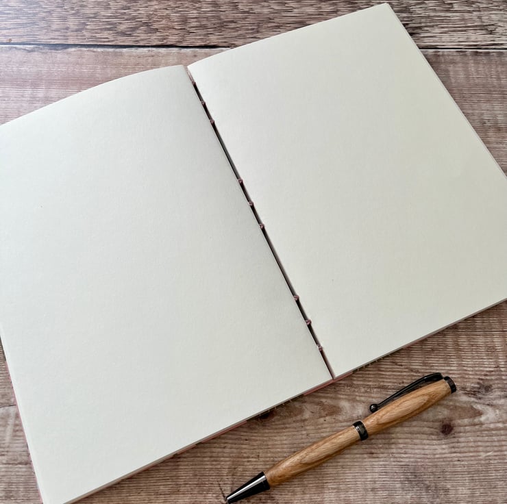 It has 56 pages (112 sides) of responsibly sourced 120gsm ivory paper, suitable for all writing and drawing mediums. The paper is folded into 7 sections. These are then stitched together to create a beautiful exposed spine binding which allows the book to rest completely flat when open.