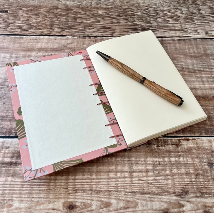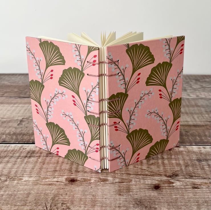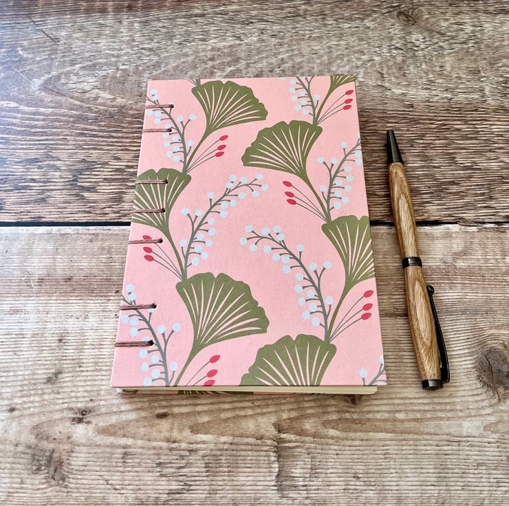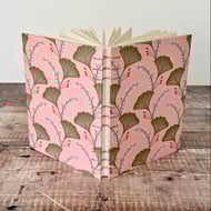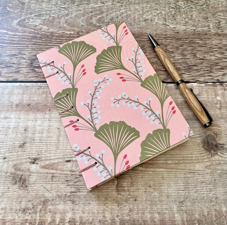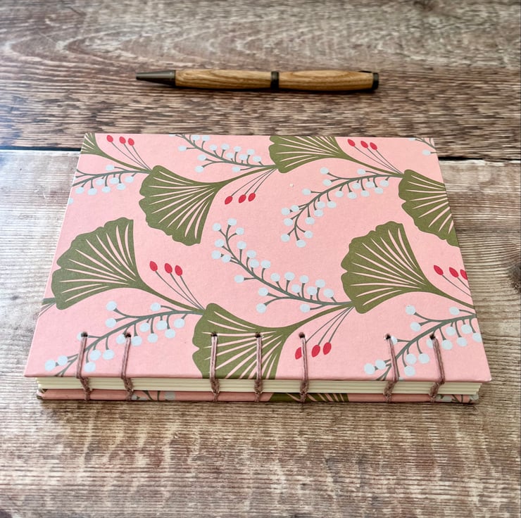 This A6 journal sketchbook has a gorgeous Ginkgo leaves themed cover on a pink background and is bound using Coptic Stitch.
