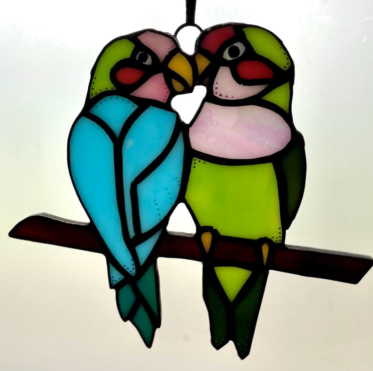 Stained glass lovebird pair suncatcher. This is an original hand crafted design, measuring approx 15x12cm.