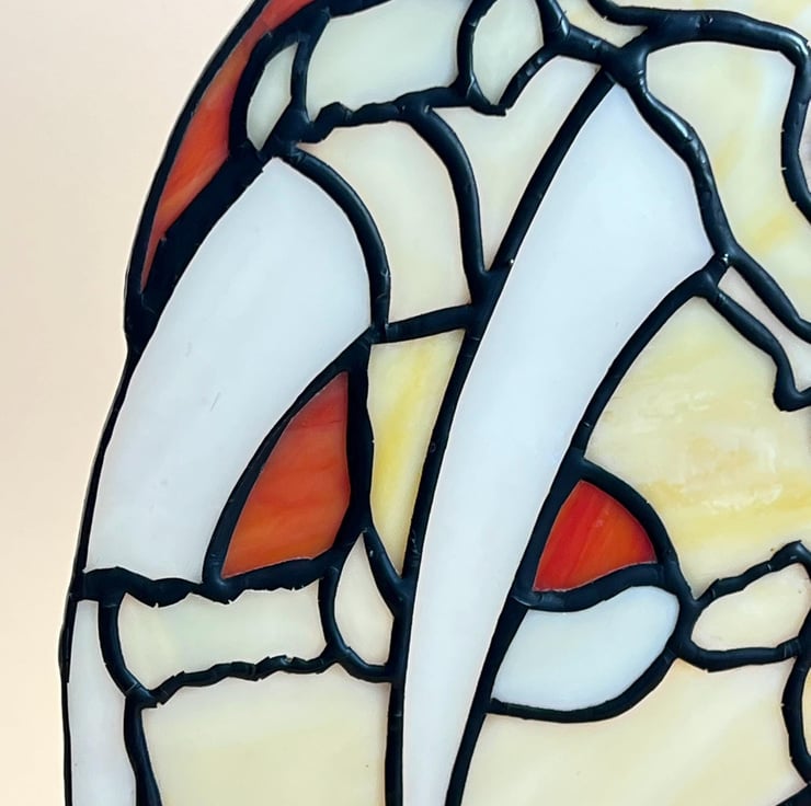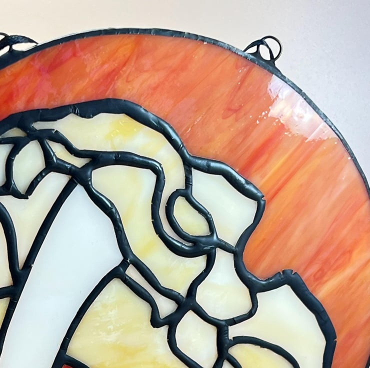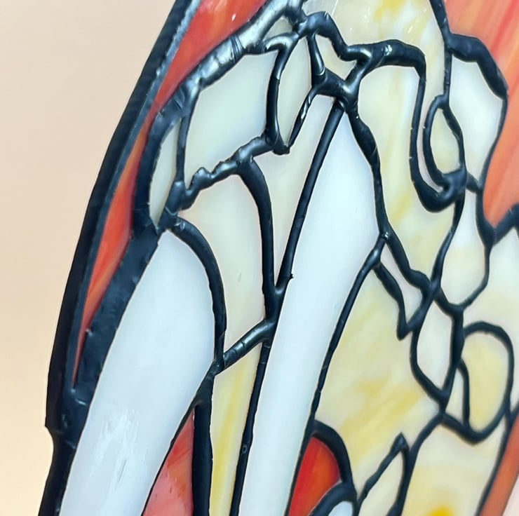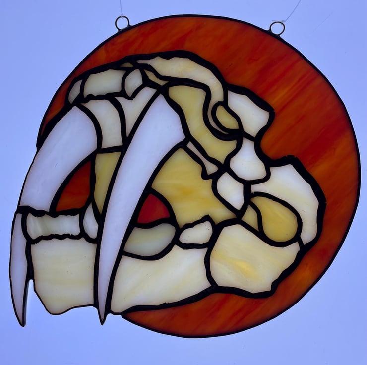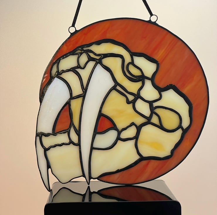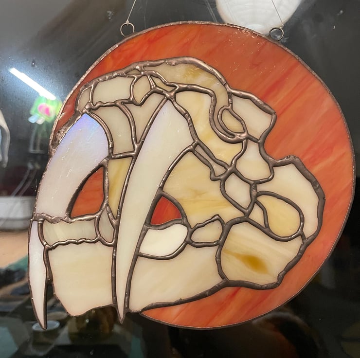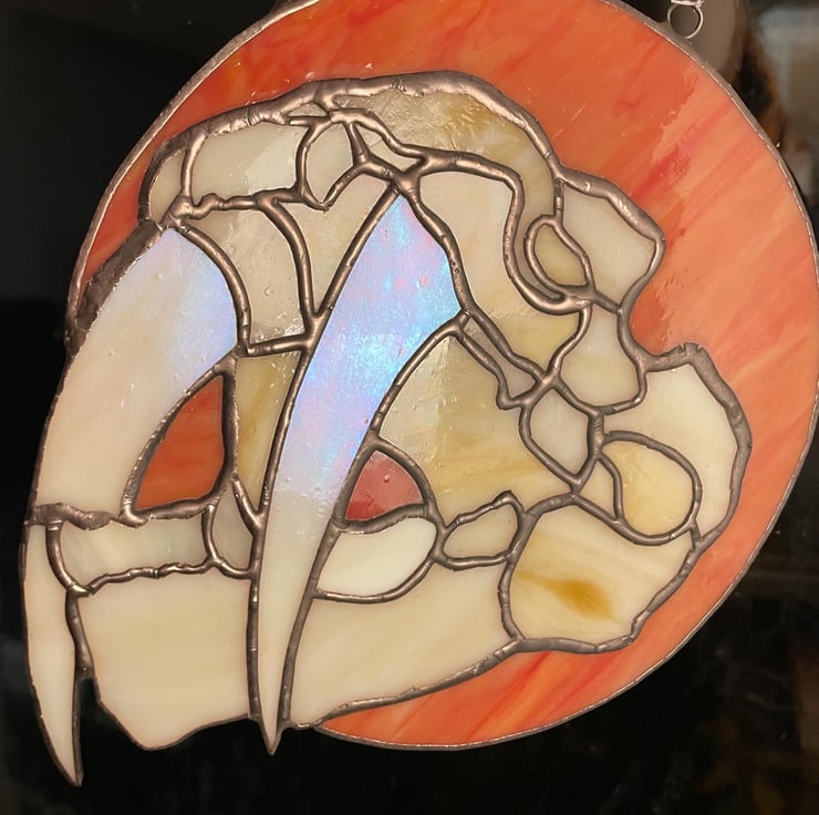 Sabre tooth tiger skull with iridescent tusks and orange background. Hangs beautifully in a window, the colours are lovely.