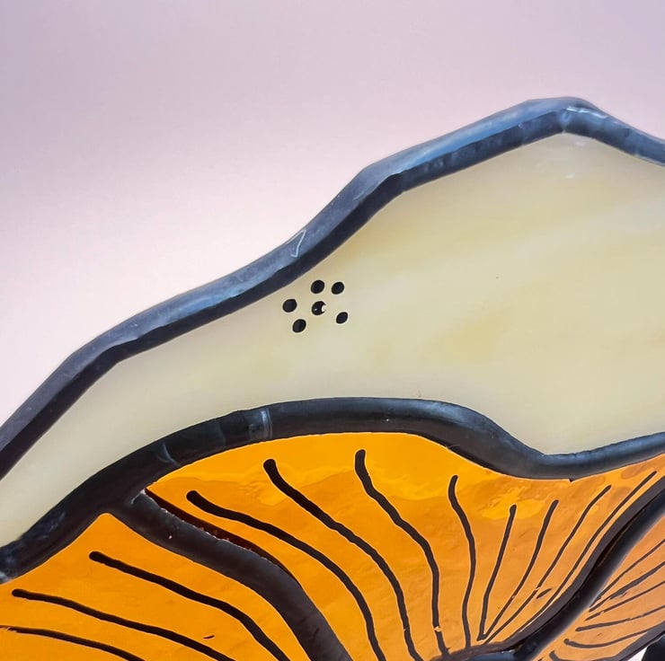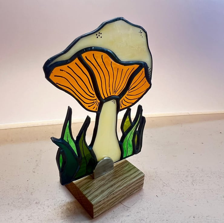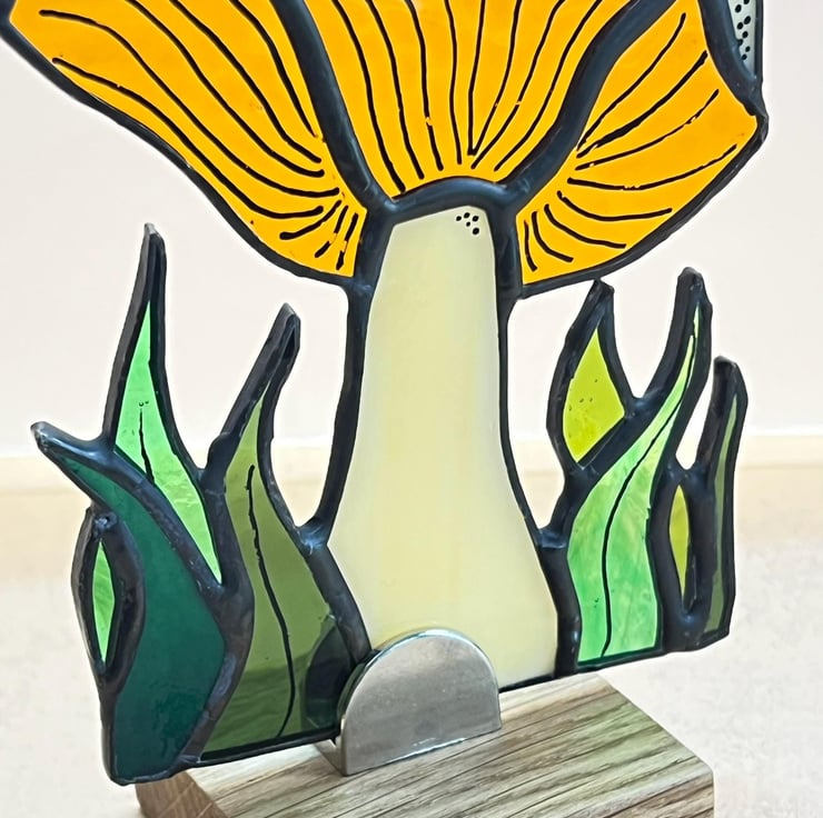 Stained glass mushroom on a wooden stand, with painted detail. This is an original hand crafted design.