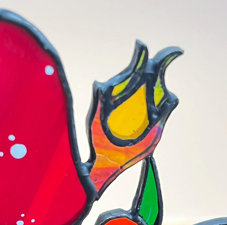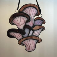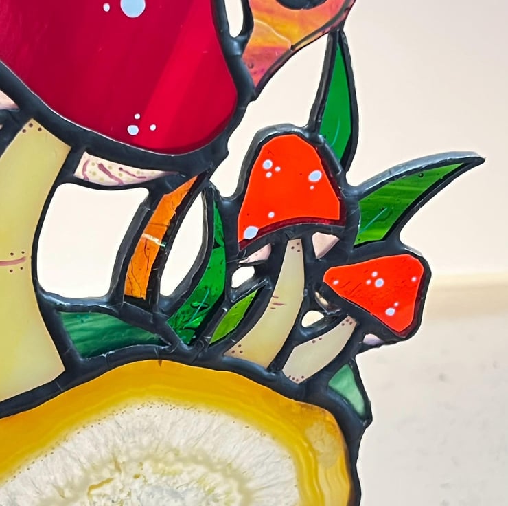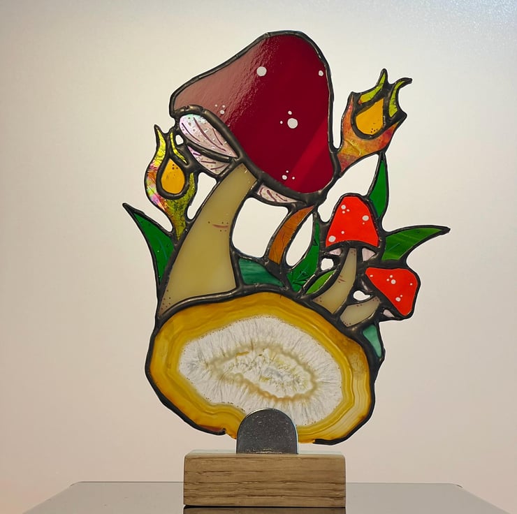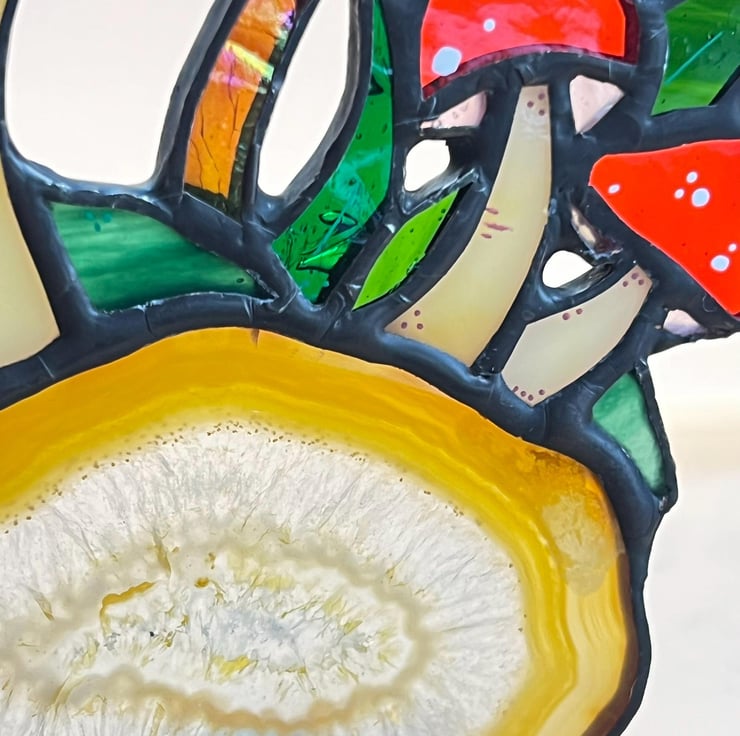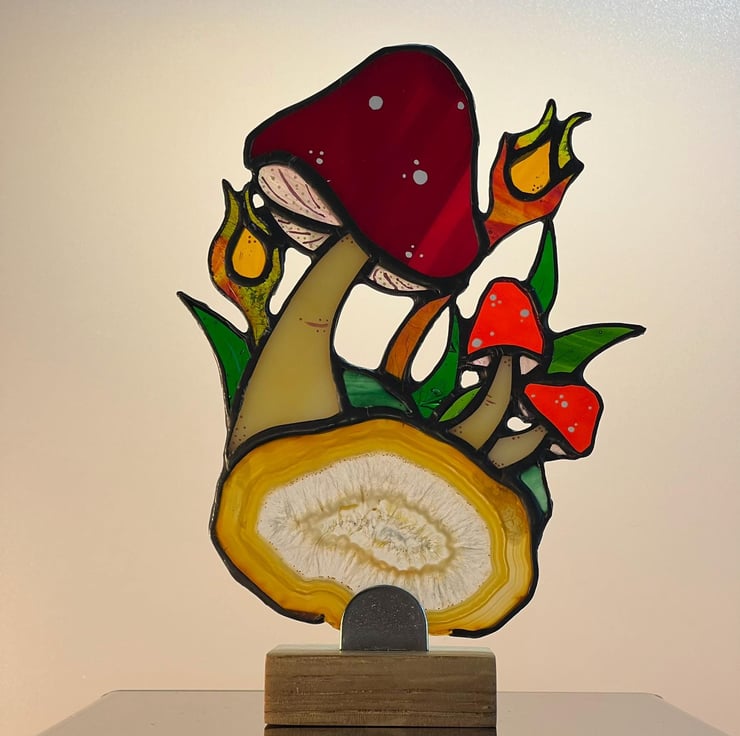 Original stained glass design. Group of toadstools mounted on a beautiful slice of agate crystal.
