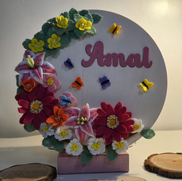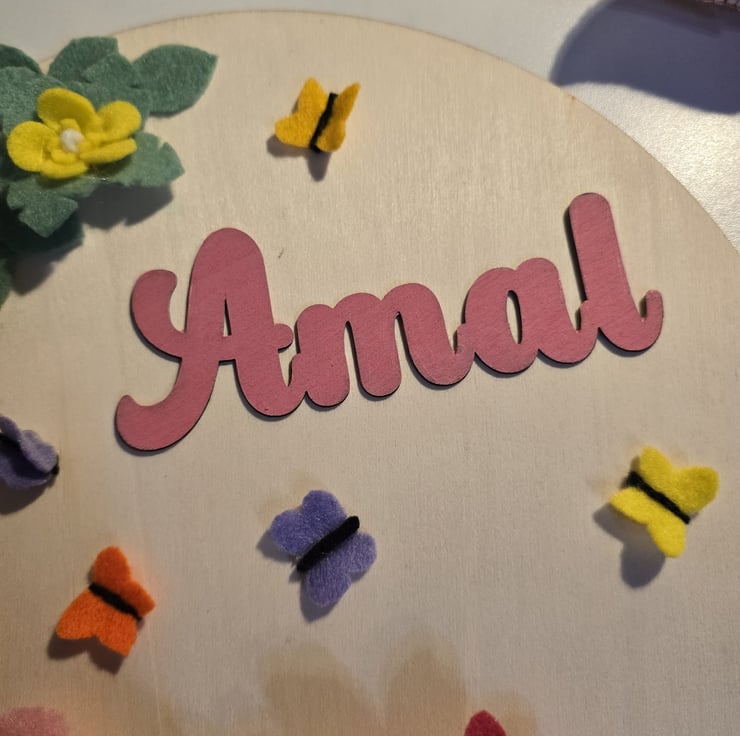 Add a touch of floral magic to your child’s room with this handcrafted personalised wall hanging, lovingly decorated with soft felt flowers, leaves and fluttering butterflies. Finished with your child’s name at the centre, it makes a truly special piece of nursery or bedroom décor.