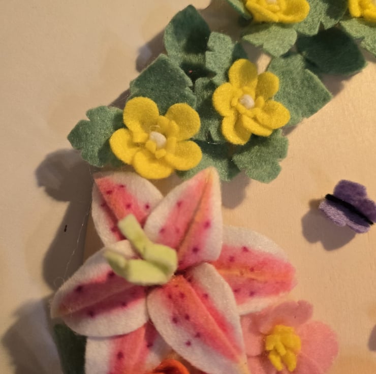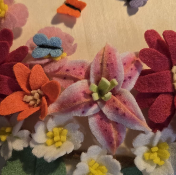I made this for my newborn baby neice, i wanted to create something bright, vibrant and beautiful just for her. i loved all aspects of creating this, from sketching the design, choosing the colours, creating the flowers and placing them. I wanted it to make something that she would love to look at. i decided to choose the vibrant flowers of spring for her wall hanging, using colours that work well on the colour wheel and creating those beautiful spring flowers. each element was taken into account and carefully chosen.