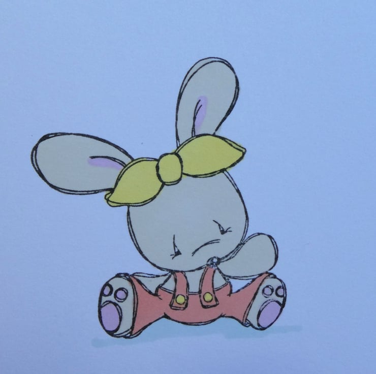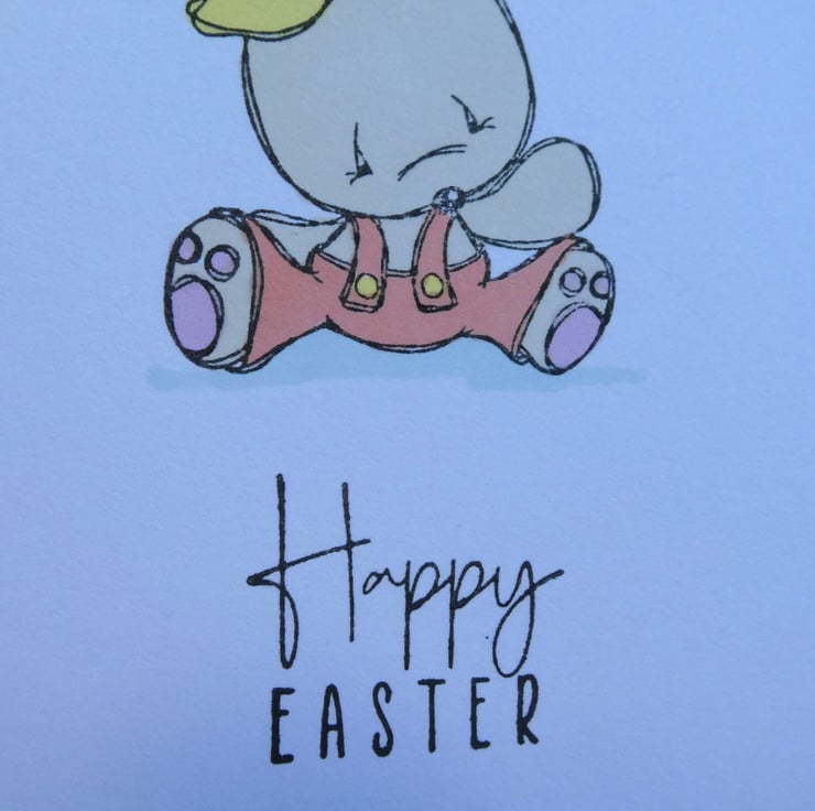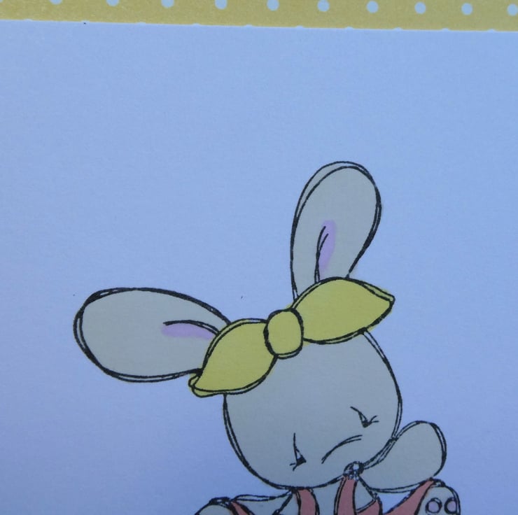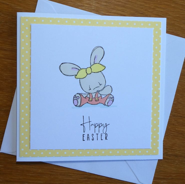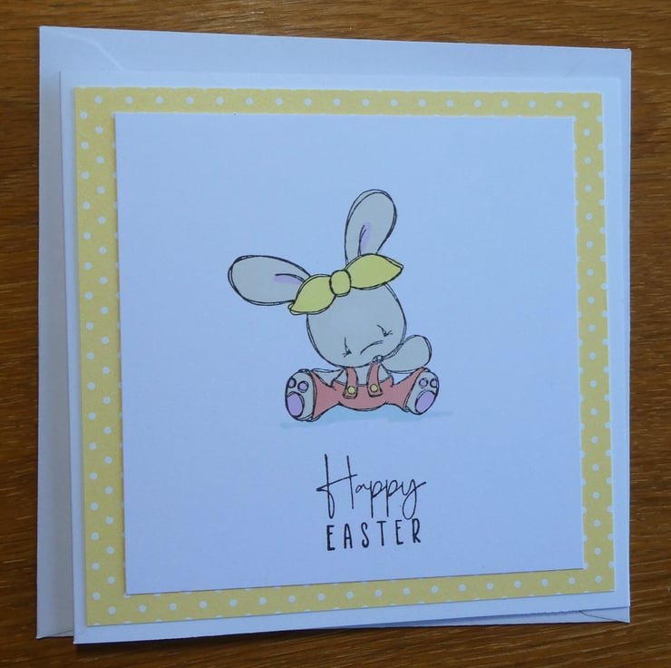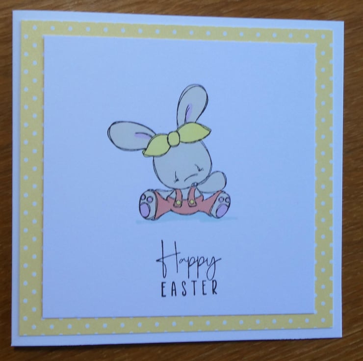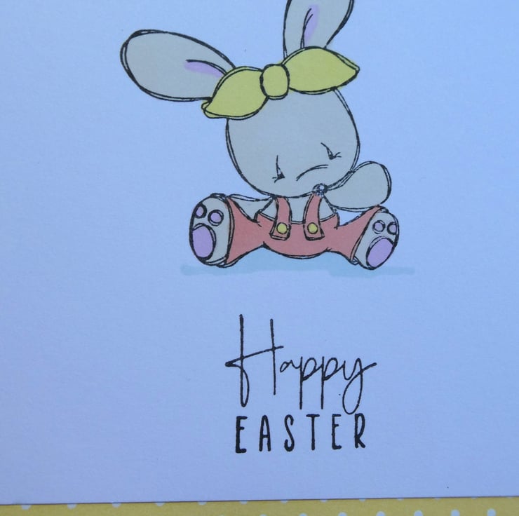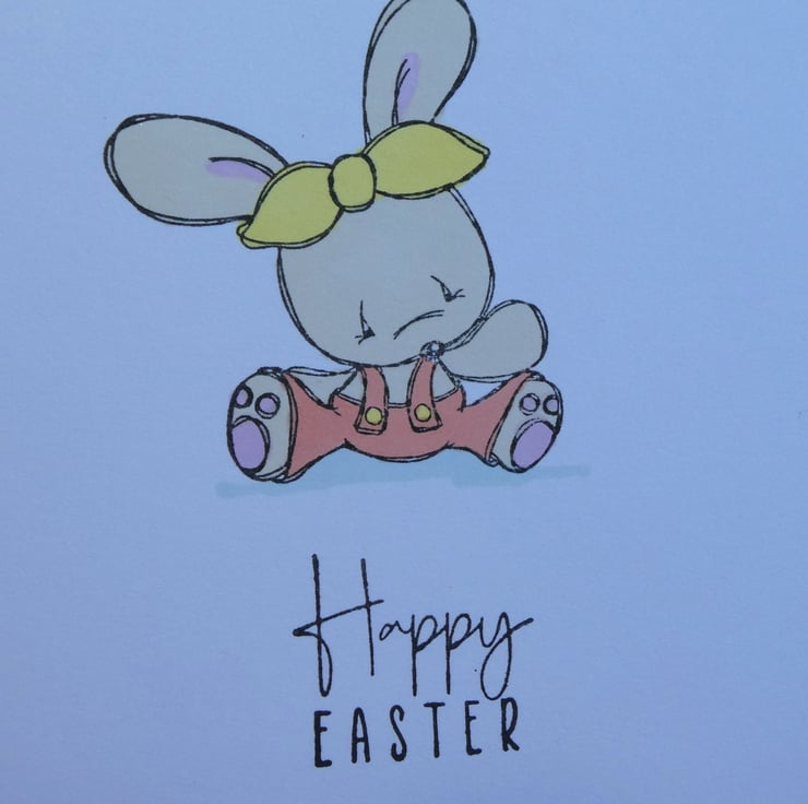 The card has been handed stamped with the image of a cute bunny, sitting on the ground wearing dungarees and a headband and then hand coloured in pastel shades of beige, pink, yellow and orange using alcohol markers. The message Happy Easter has then been hand stamped in black archival ink.
