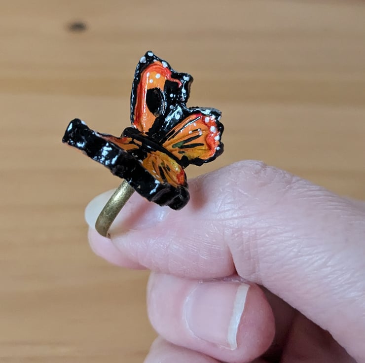 This lovely handcrafted butterfly has been made from air dry clay, hand painted and varnished, it is attached to a bronze coloured ring made from iron, the ring fits most sizes as it is adjustable, it's size before adjusting is 1.8cm.