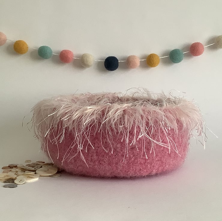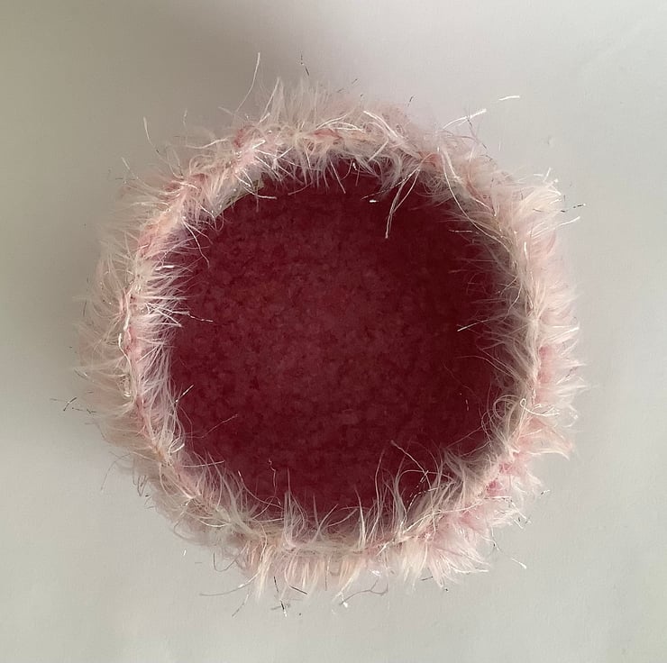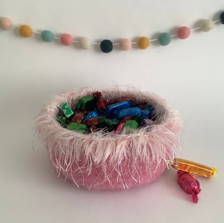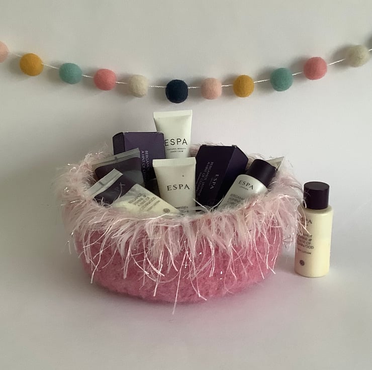 I have designed and made this perfectly useful and pretty 'Fusspot' bowl /desk tidy using 100% wool and added a decorative fringe to the top edge for added interest. I wash and form the bowl using locally made natural soap mix - this helps give a lovely nubby, dense texture.
