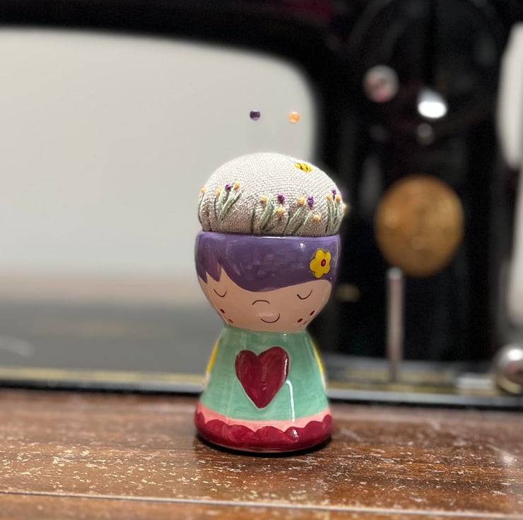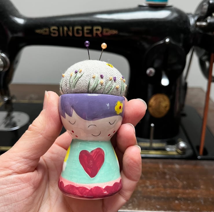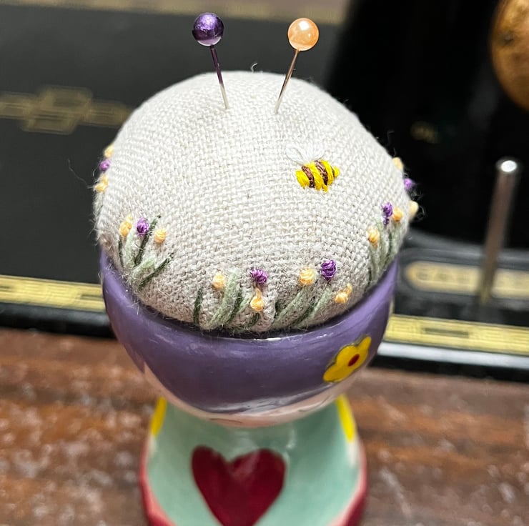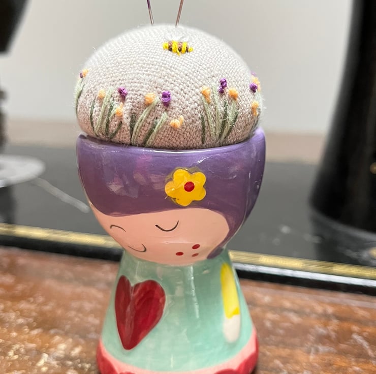 Cute embroidered pincushion in a colourful egg cup in the shape of a little person. The linen cushion has been embroidered with tiny flowers and a bee.