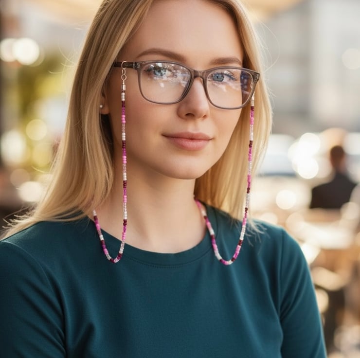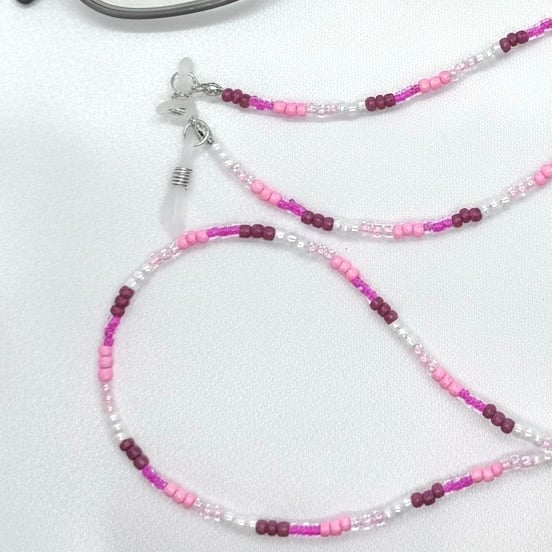This sweet handmade glasses chain is lovingly crafted with Czech glass seed beads, strung in a gentle mix of blush pinks, clear beads, and deep berry tones. Simple, cheerful, and full of handmade charm, it’s a lovely way to keep your glasses close while adding a pop of colour to your day.