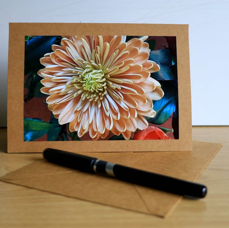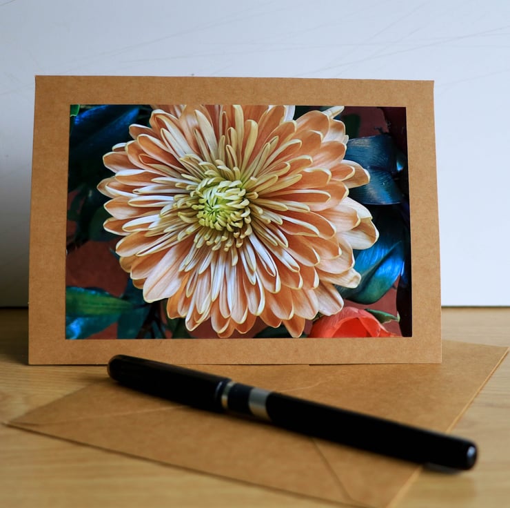 Celebrate the beauty of our garden blooms with this beautiful image of a Chrysanthemum flower head ,professionally printed and mounted on high quality Kraft card stock, blank inside for your own message. Perfect for birthdays, thank-yous, or seasonal notes or as Frameable art. Comes with a Kraft envelope. Please DM me if would like a larger print of this image.