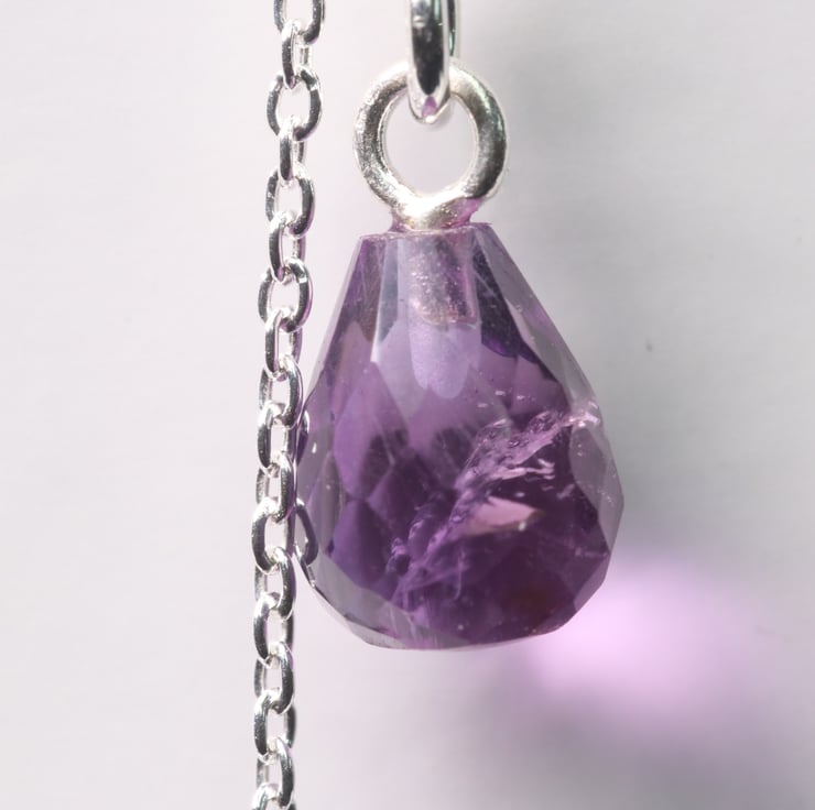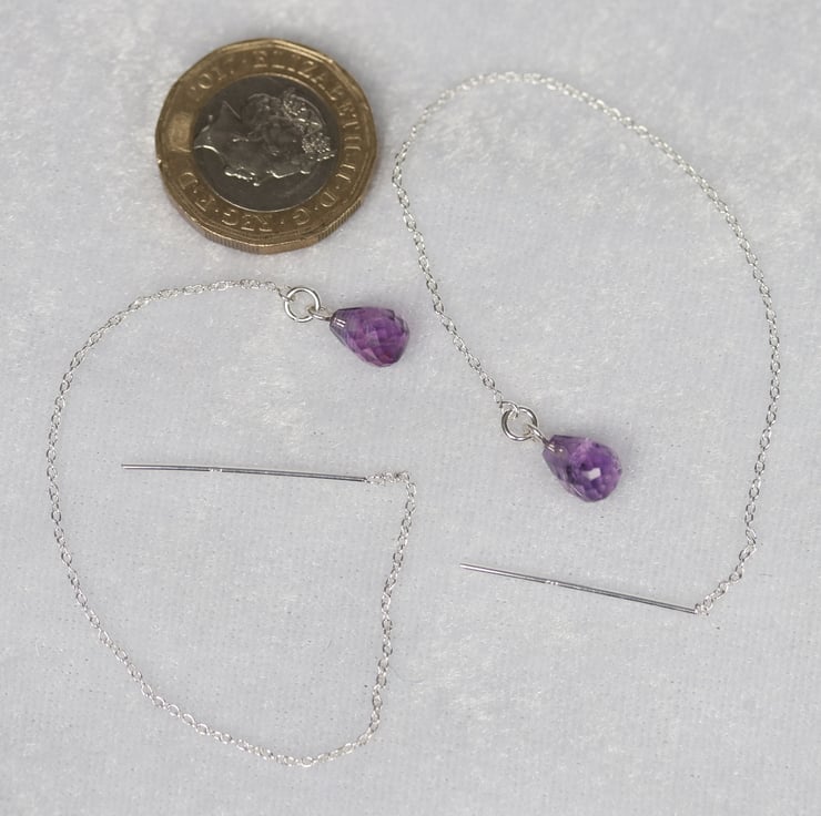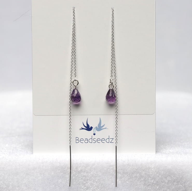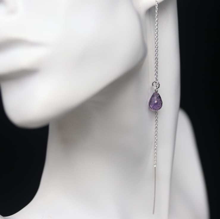 Some pretty and very simple sterling silver threader earrings with a faceted amethyst tear-shaped dropper. Ideal for anyone who likes simple but elegant jewellery. Would make a lovely birthday gift for a February birthday. All the metallic elements of this piece are sterling silver.