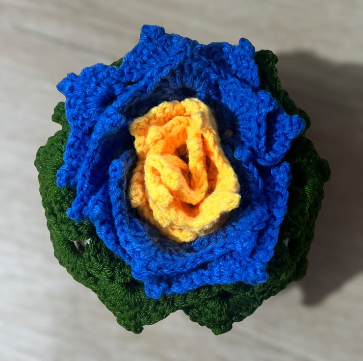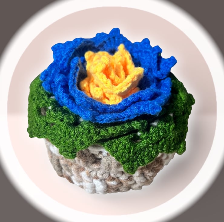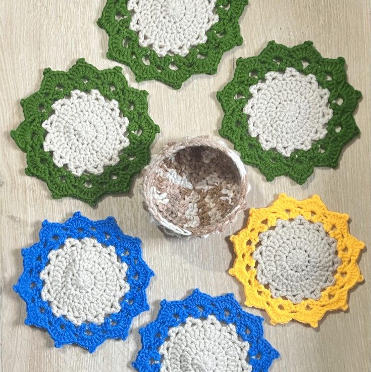 Add a pop of colour to your home with these handmade crochet flower coasters. This set includes 6 coasters and a storage basket. The coasters are made with a soft milk cotton blend (casein/acrylic mix). Each has an off white centre surrounded by colour. The colours are yellow, dark blue, and green. The basket is also made with soft milk cotton blend (casein/acrylic mix) and has a removable PETE plastic ring to help keep its shape. When the coasters are all placed in the basket they resemble a potted flower. The basket should be hand washed, but the coasters are machine washable. The coasters are 14 – 15 cm in diameter. The storage basket is 10 cm in diameter and 5.5 cm high. When the coasters are in the basket the height is about 8 cm. These coasters are not only great for glasses and mugs but they are also large enough for small bowls.