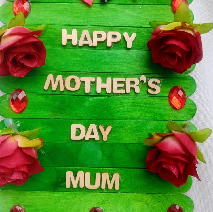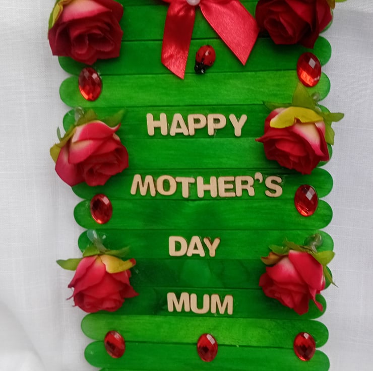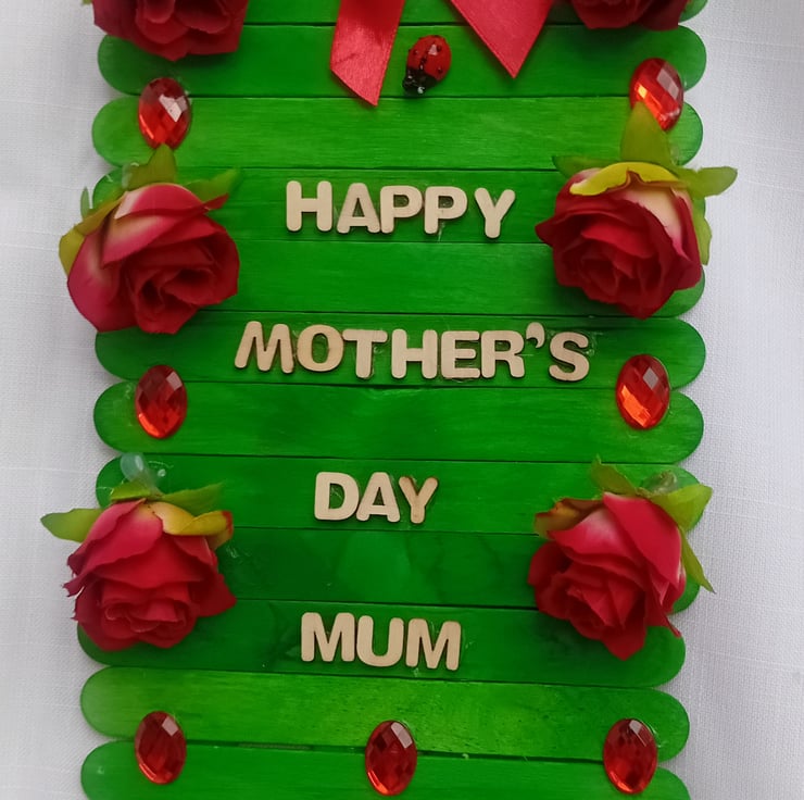 This lovely handmade, one of a kind wall hanging would make a lovely gift for Mother's day. Wall hanging is made with, lolly sticks, artificial red roses, wooden letters, satin bows acrylic oval cabochons, glass ladybirds, acrylic half pearls and velvet ribbon.