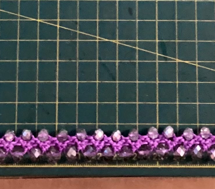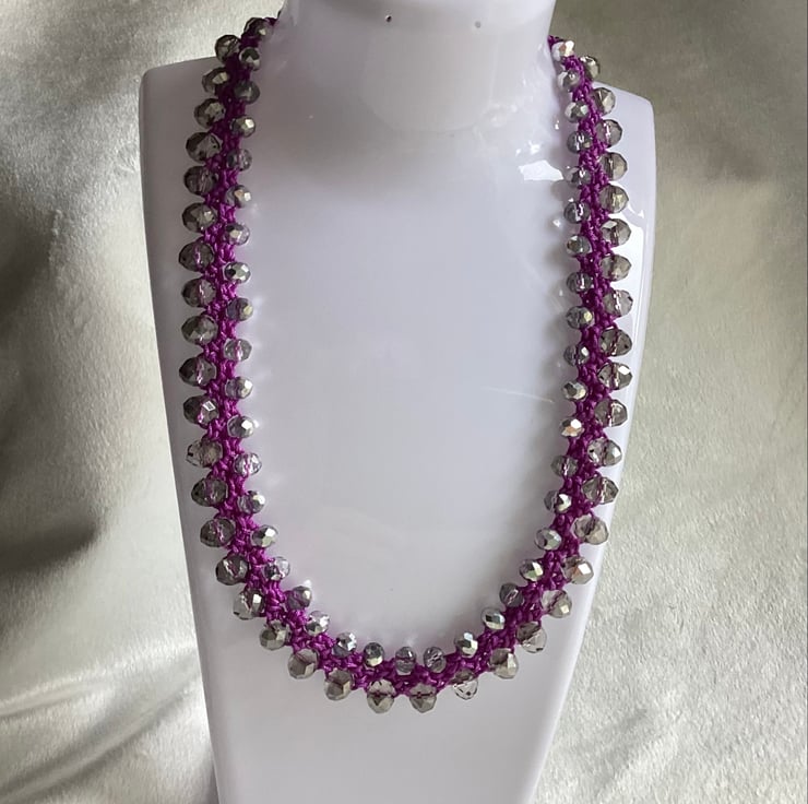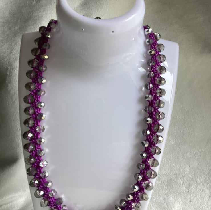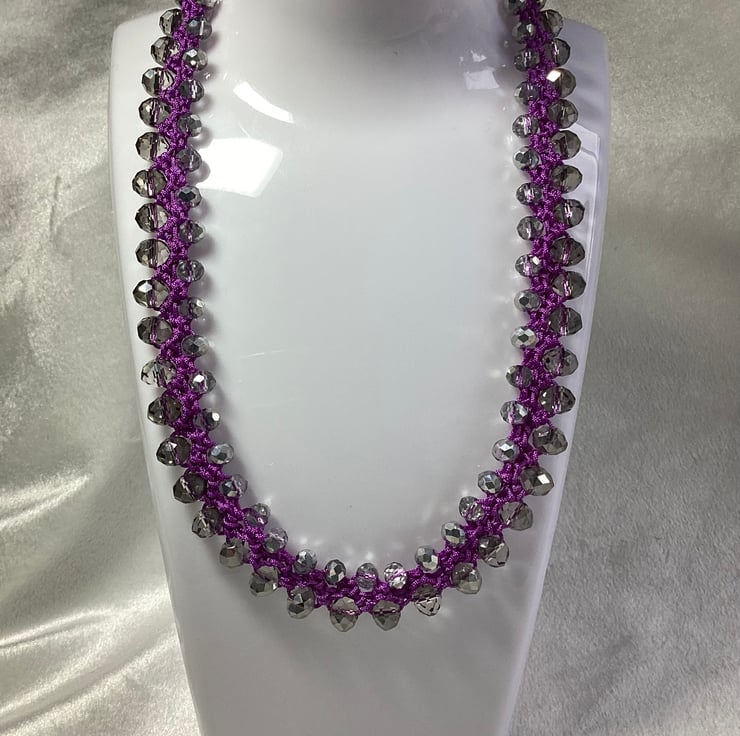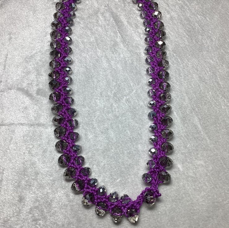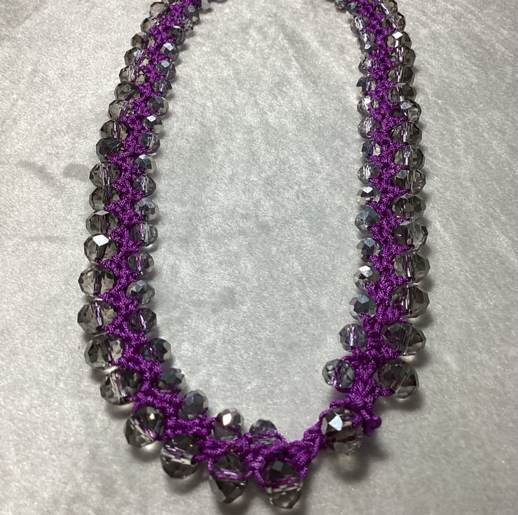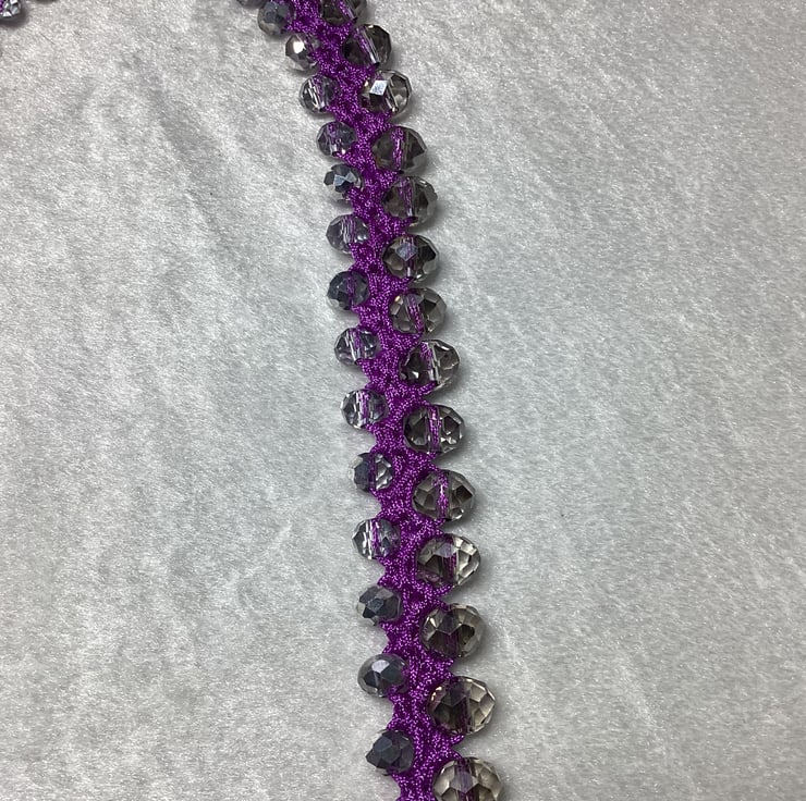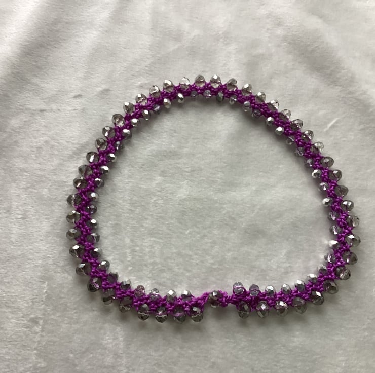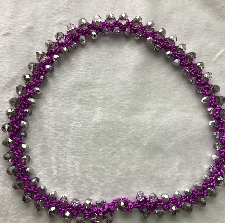 I’ve used grey colours glass beads . Crochet with woven purple cord.