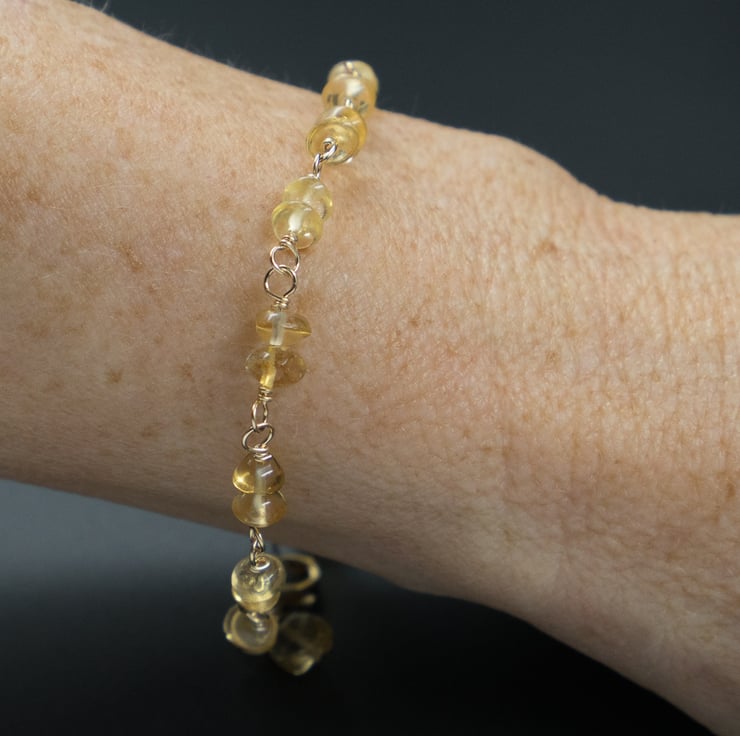 4mm smooth button beads of honey citrine are hand wrapped onto individual links of fine gold filled wire to create this dainty bracelet.