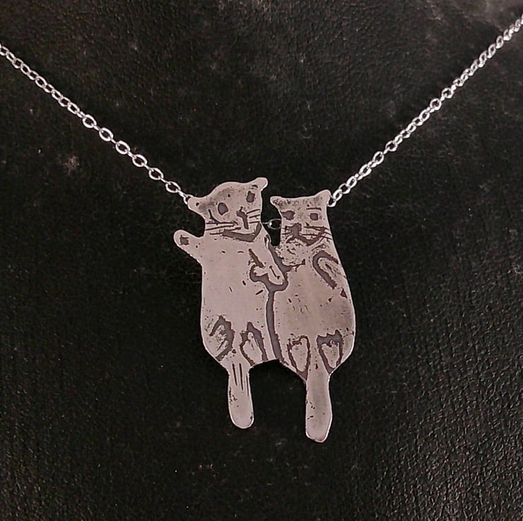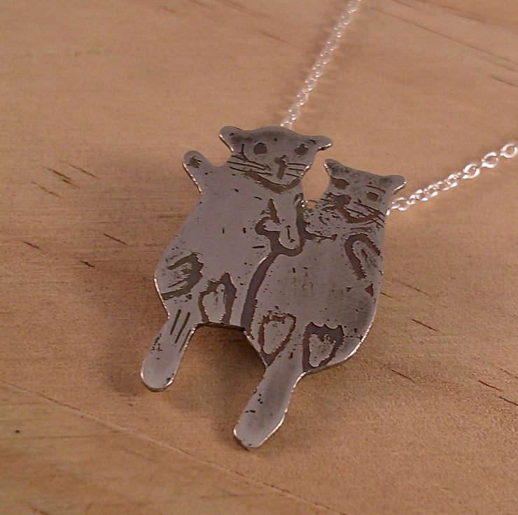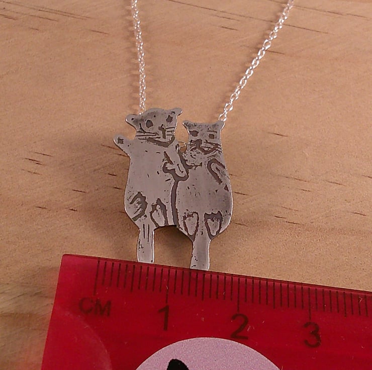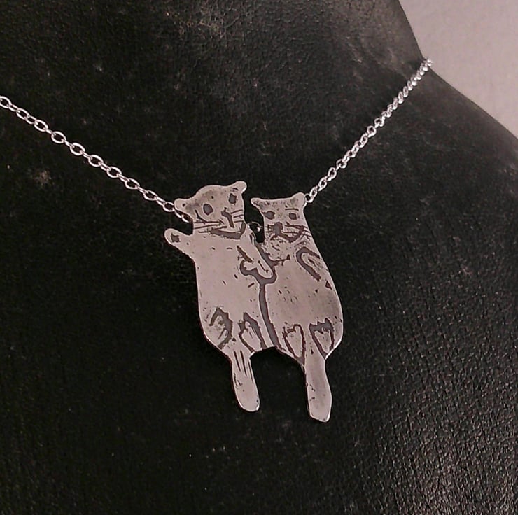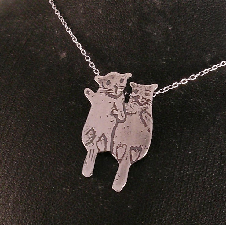 The shape of the two otters has been hand pierced from a sheet of sterling silver. The details have been hand drawn and etched. Two loops have been soldered to the back for the chain, and the necklace has been oxidised to blacken the etched details.