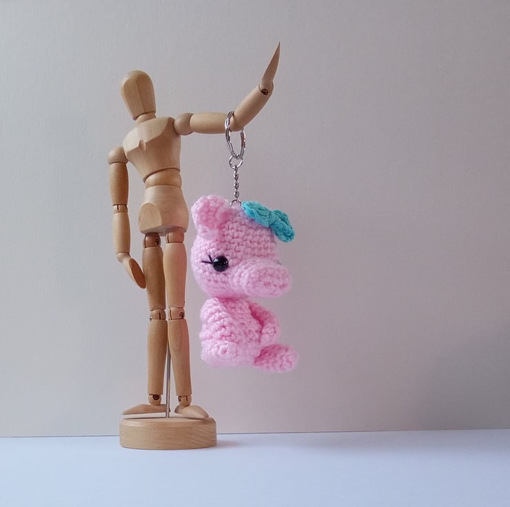 Introducing Piggy Sue, the sweetest little pink pig amigurumi crochet bag charm you'll meet.