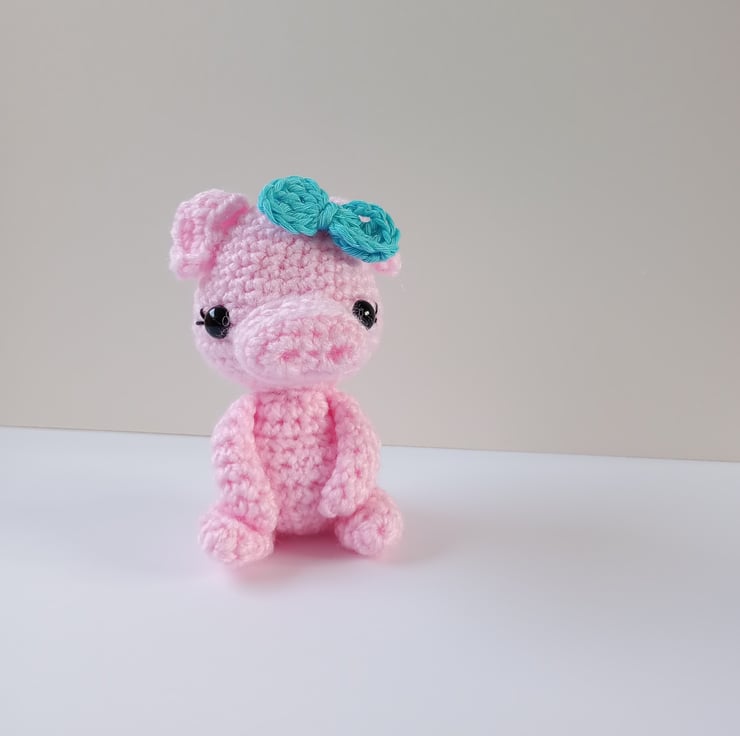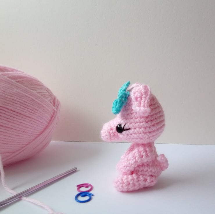 She is sitting pretty in pink yarn with a curly tail and pink ears. Showing off her blue bow handmade in cotton yarn and flattering black embroidered eye lashes.