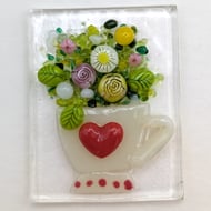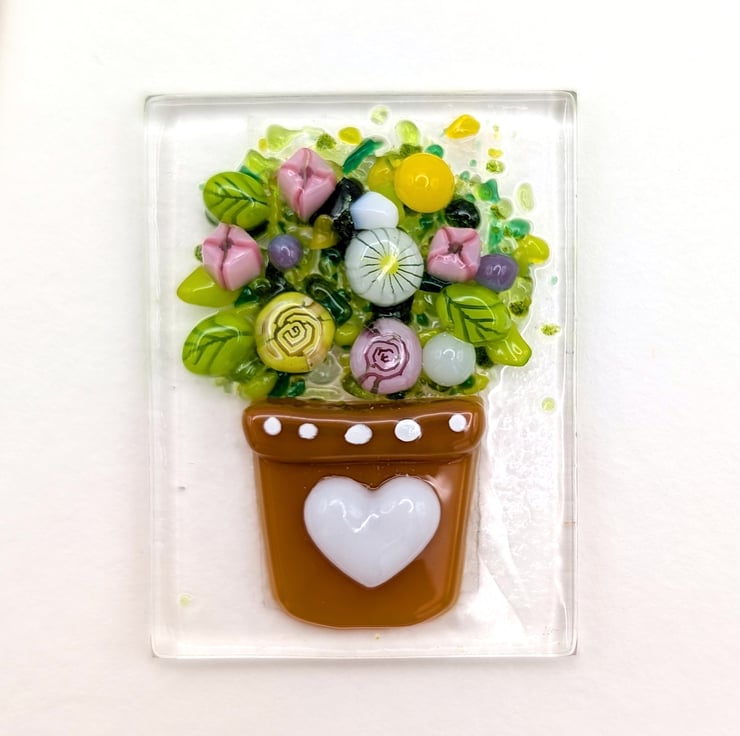 At the base, a warm terracotta flowerpot features delicate white accents and is topped with a soft white heart at its center. Emerging from it is a vibrant array of glass flowers and leaves in shades of pink, yellow, green, and gentle white—each piece slightly raised and glossy, reflecting light in that distinctive fused-glass style.