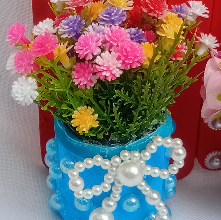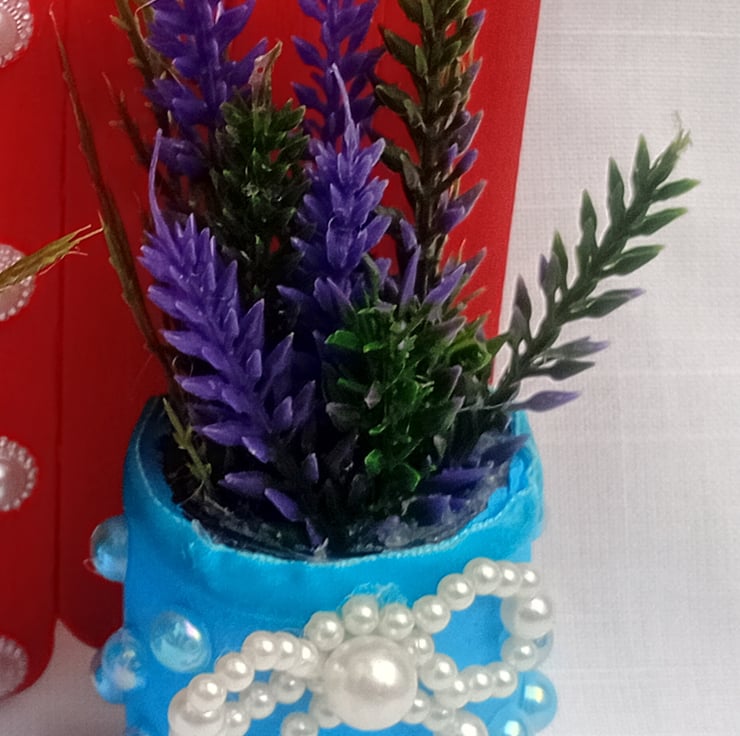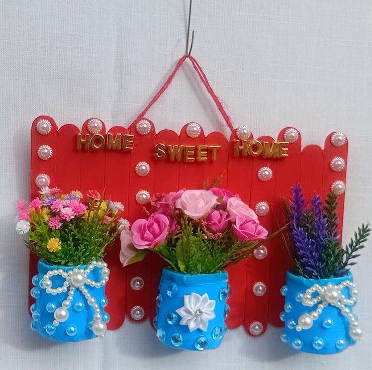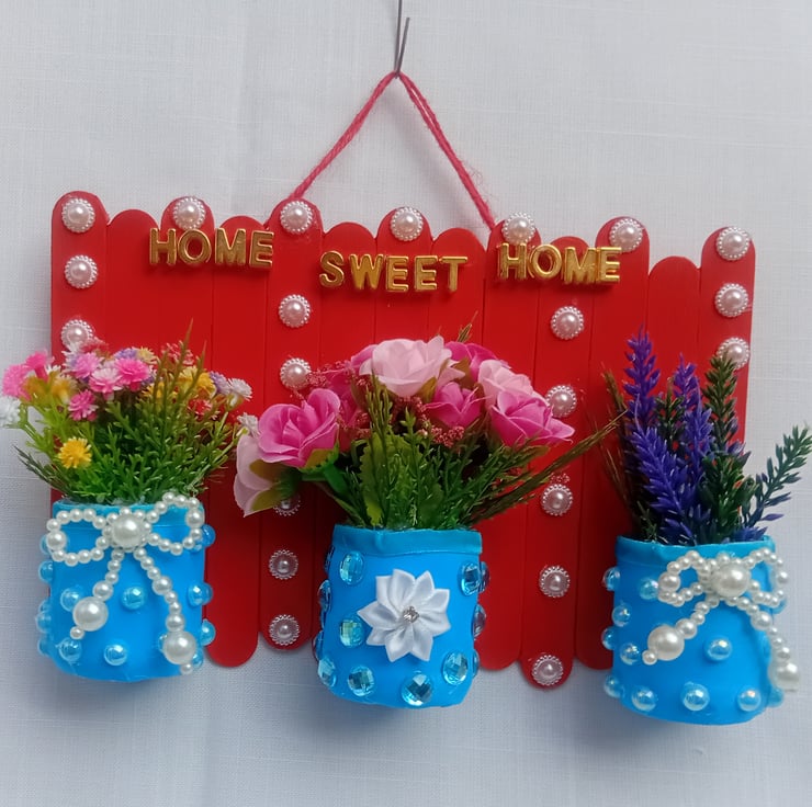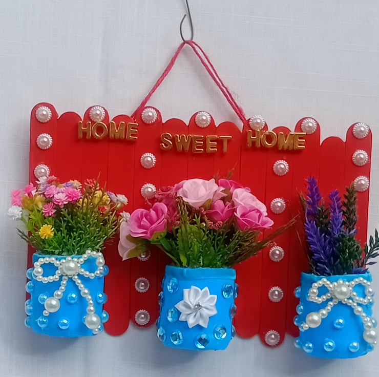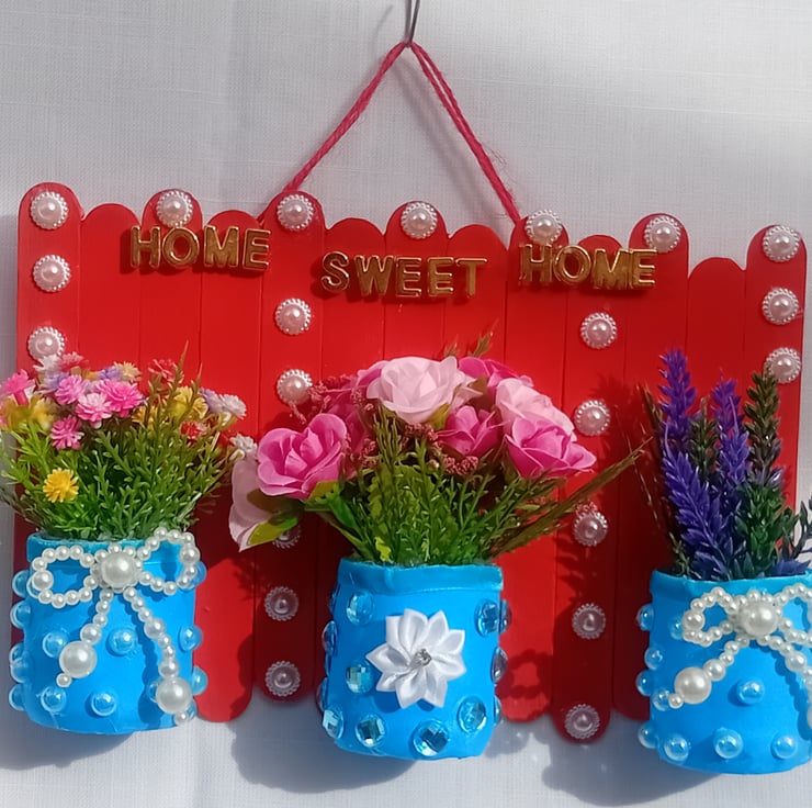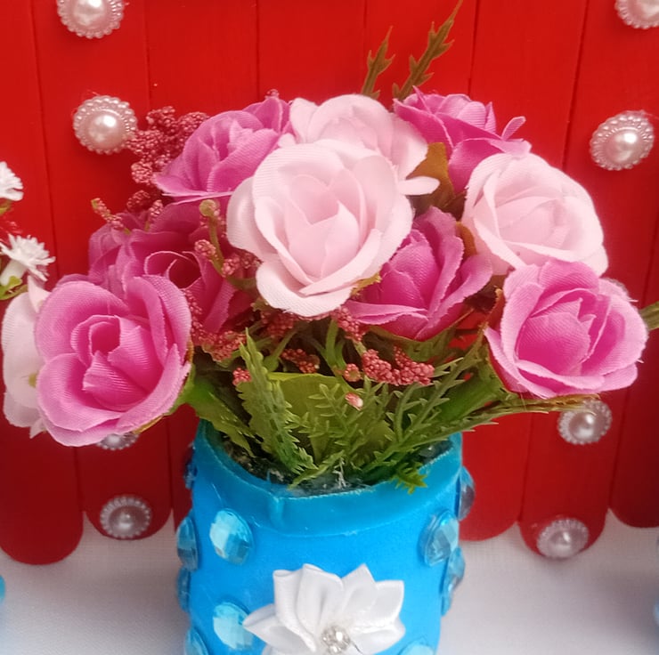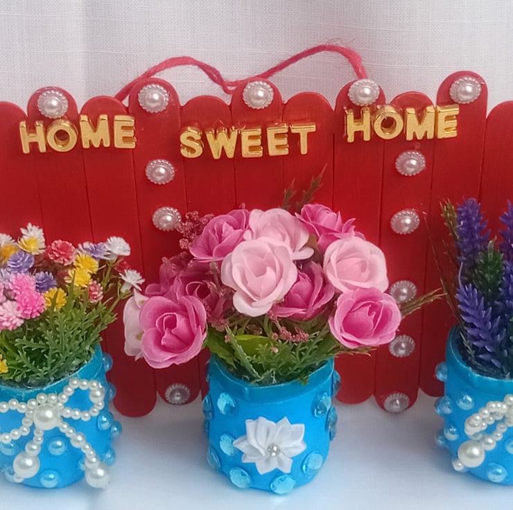 This lovely one of a kind decoration is handmade with lolly sticks, upcycled mini glass jars, artificial assorted flowers, flower ribbon, acrylic pearl bows, half pearl acrylic cabochons, acrylic jewel cabochons and gold colour letters. A lovely gift for a birthday, new home, christmas or any other occasion.