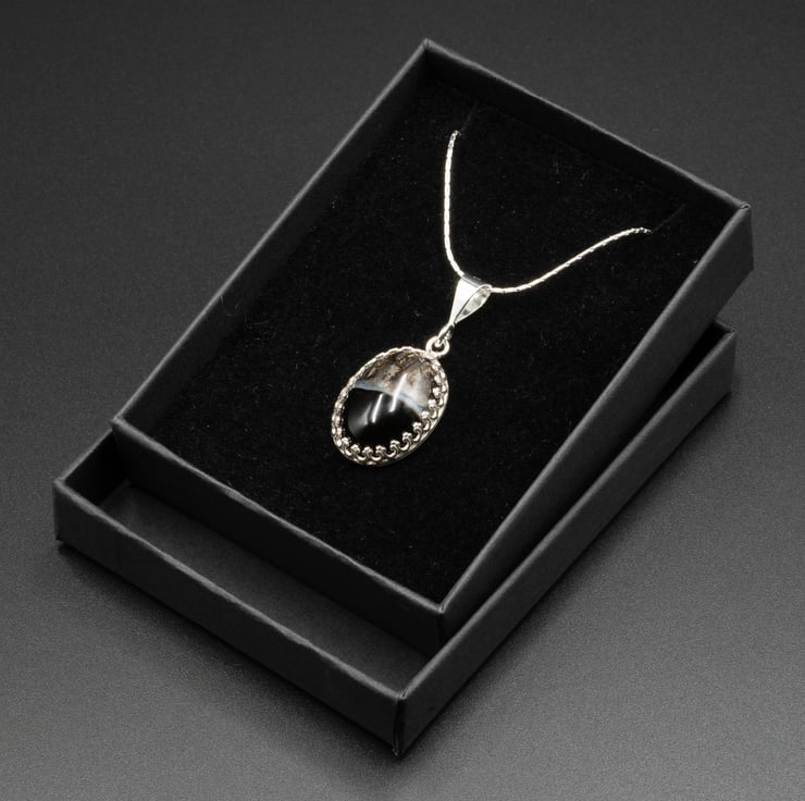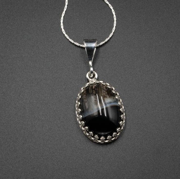 A lovely banded black agate cabochon is set in a sterling silver crown design pendant mount with an open back and hangs from a sterling silver chain which fastens with a spring ring closure.