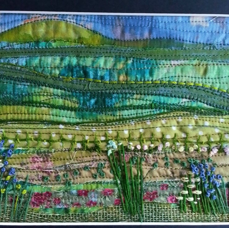 Printed cotton fabric was cut and layered, then machine stitched for the contours of the landscape.
