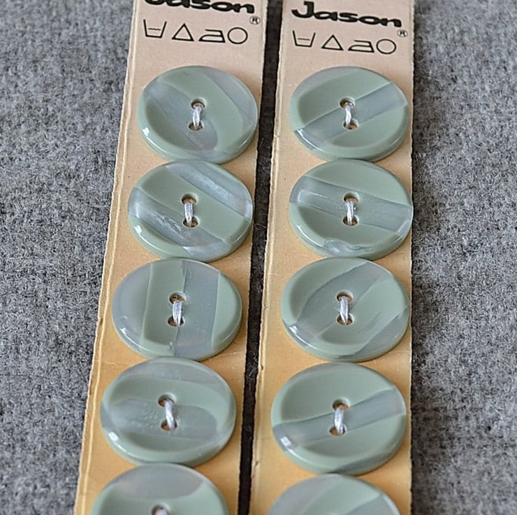 These buttons are a very pretty soft green, with a transparent stripe in the pattern. A really lovely vintage find. 1 unit containing 10 buttons (2 cards of 5 buttons) available.