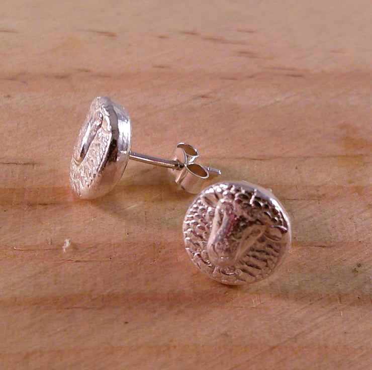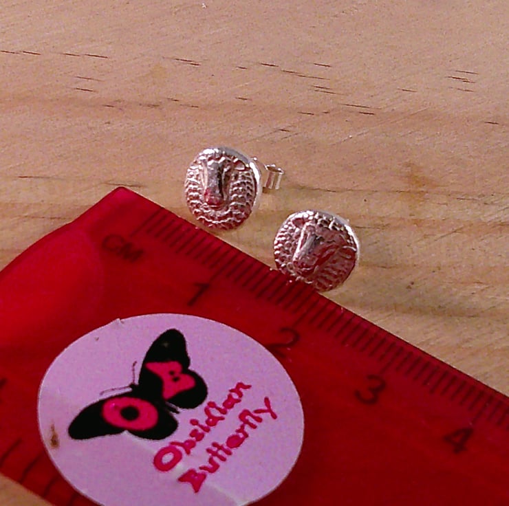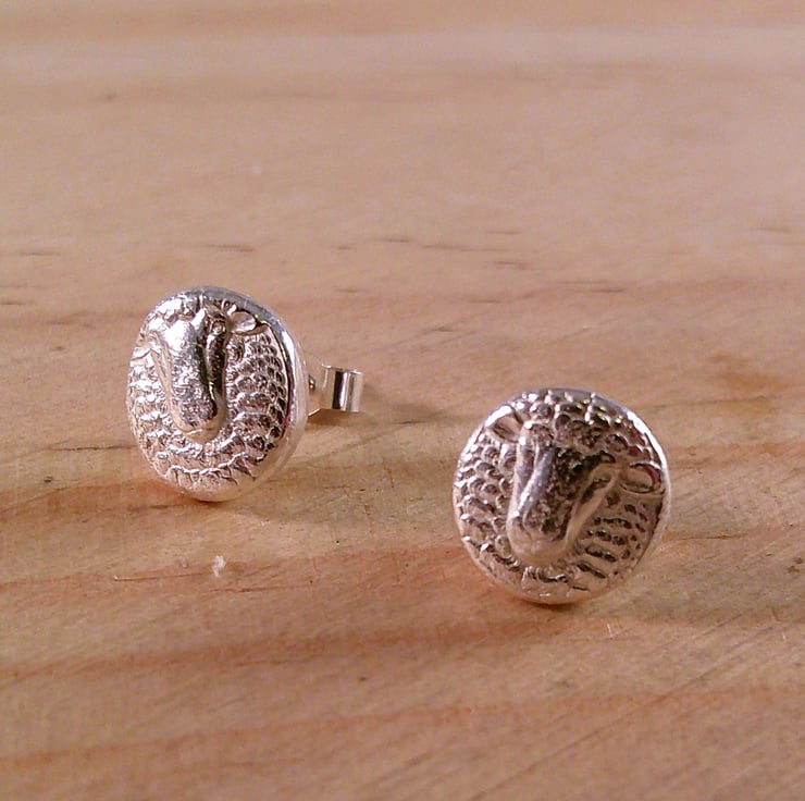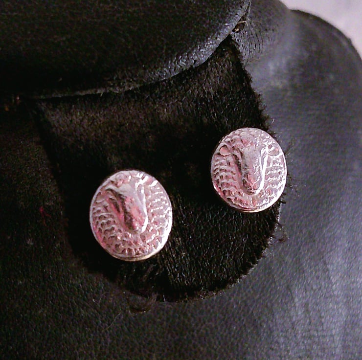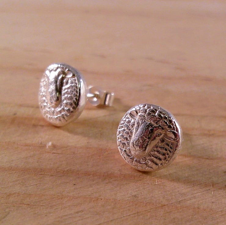 Scrap silver has been melted into a ball, which in turn has been pressed into a mould of a sheep head. A hand made sterling silver ear post has then been soldered to the back and a sterling silver butterfly back added.