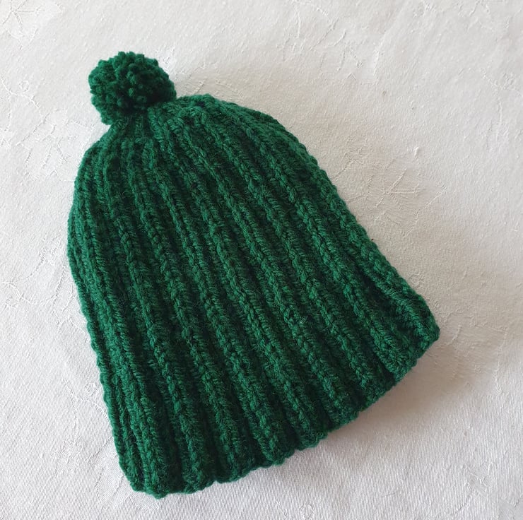 Hand knitted in Bottle Green, acrylic/wool mix yarn.