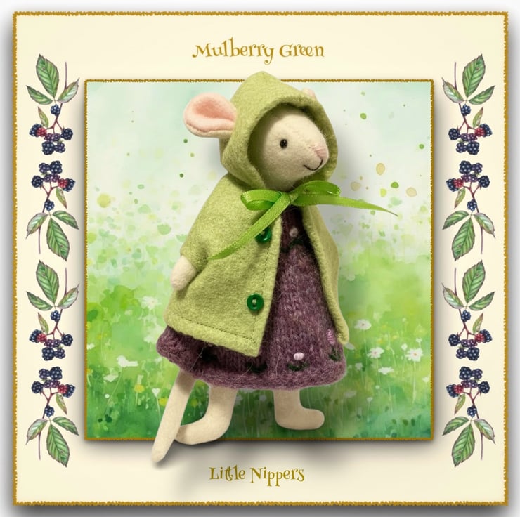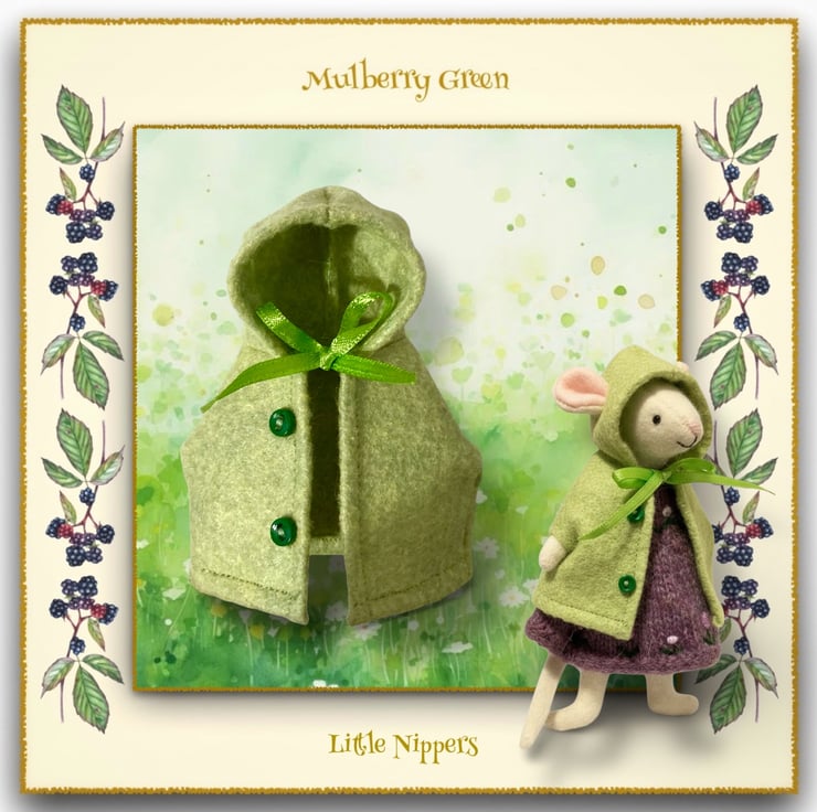 A cute little pistachio green hooded cape, decorated with two tiny green buttons, made specially to fit the Little Nippers. The cape has little slots for the mouse’s ears and hands and fastens with a green bow. The cape here is modelled by Verity Thistle. Mouse not included.