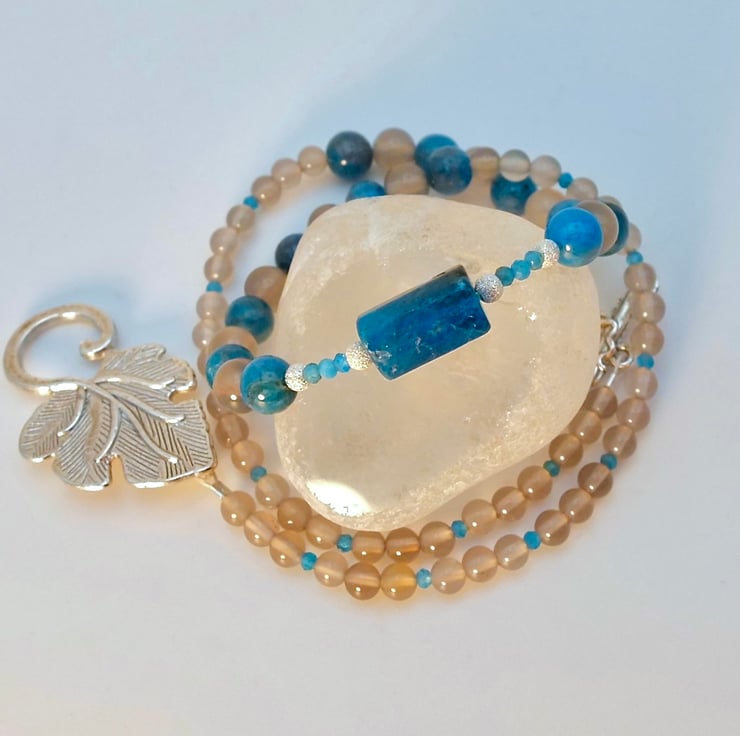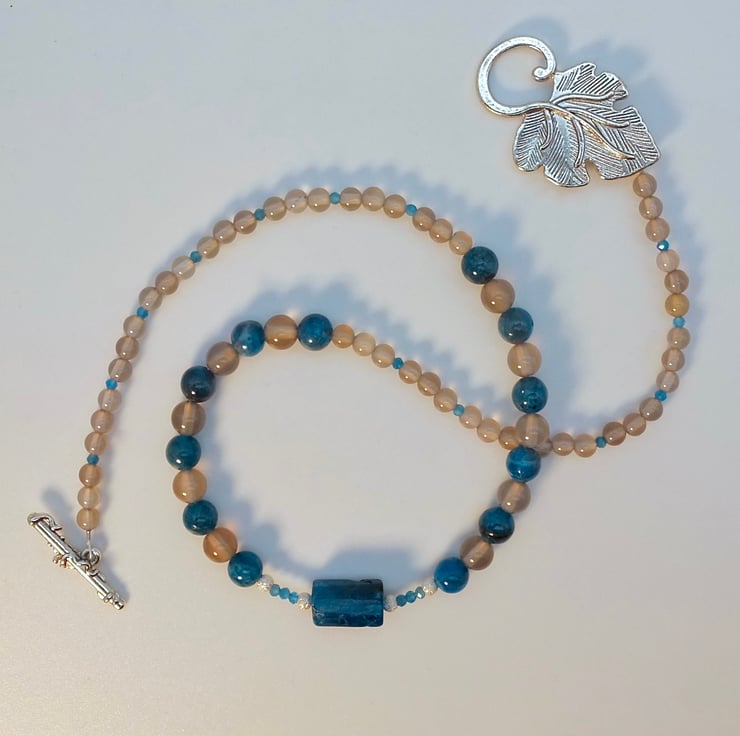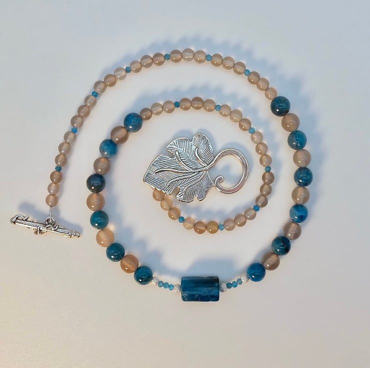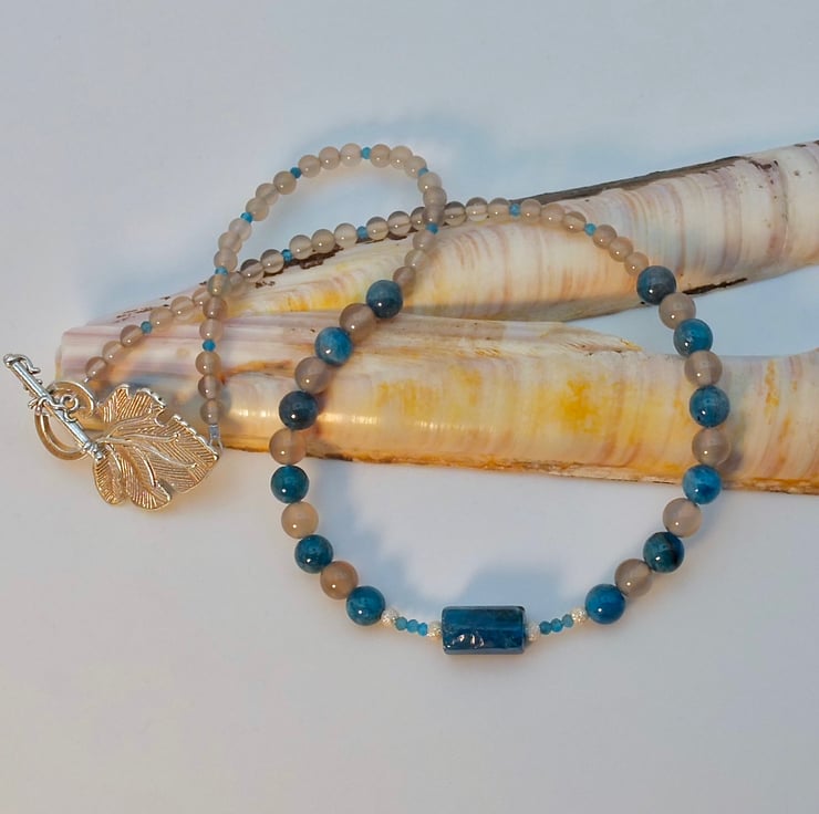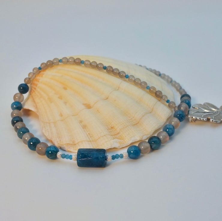 The main body of the necklace comprises alternating 6mm beads of natural Ocean Blue Apatite and Grey Agate, graduating to 4mm Grey Agate interspersed with 2mm faceted Apatite beads.