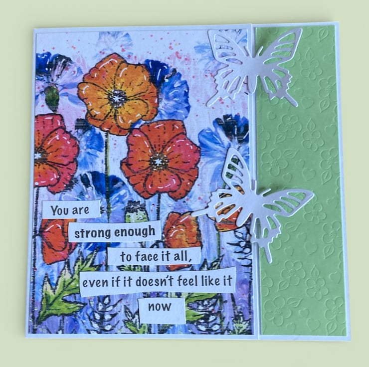 The sentiment on the front, which has been hand fussy cut, reads, “You are strong enough to face it all, even if it doesn’t feel like it now,” making this card especially suitable for moments of encouragement, support, or simply letting someone know you are thinking of them.