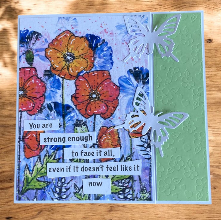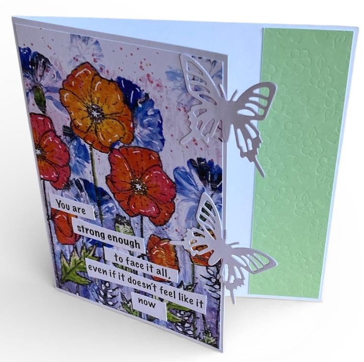 This handmade 6 x 6 inch card is designed to send comfort, strength and reassurance when words are hard to find. It features bold, poppy-style flowers in warm oranges and soft blues, layered over a lightly textured background. Two delicate white die cut butterflies add a gentle, hopeful touch, alongside a green embossed panel on the inside for extra depth.