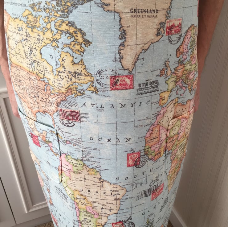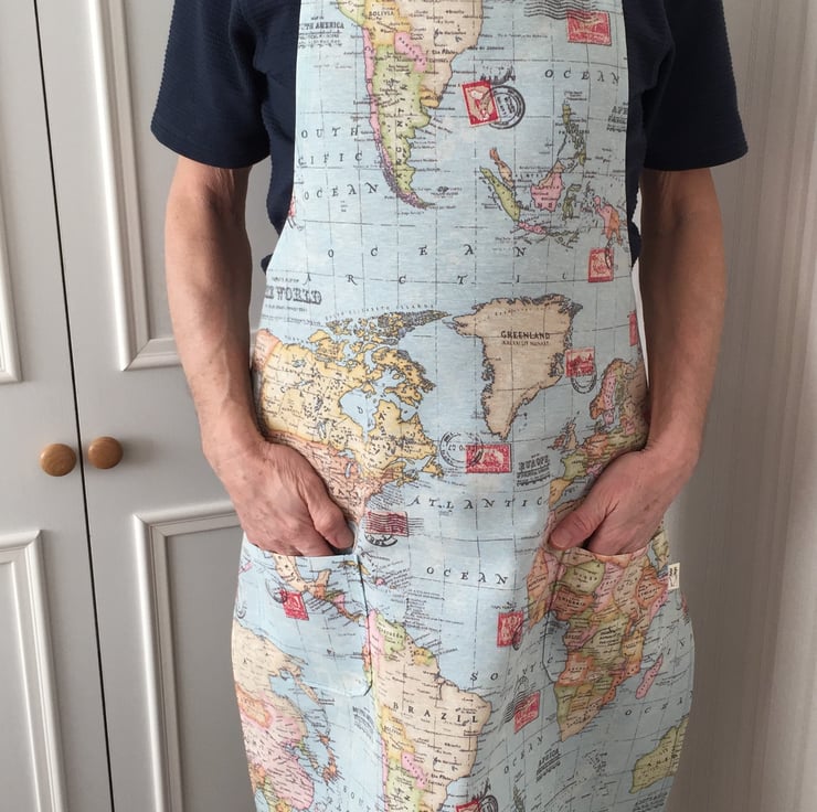 This large apron is made from a cotton rich fabric with an Atlas theme. This apron features 2 patch pockets and is a one size large apron - measurements below.