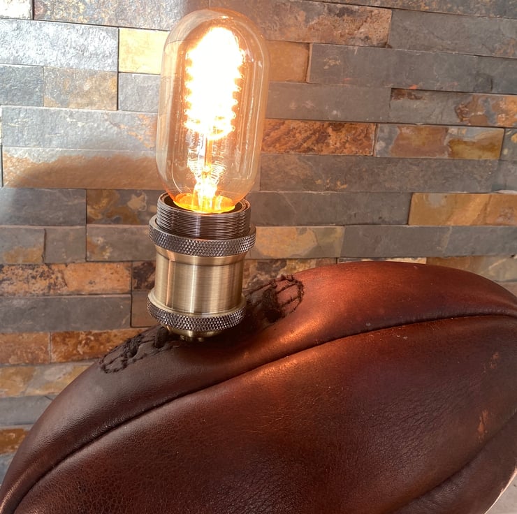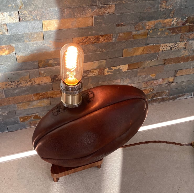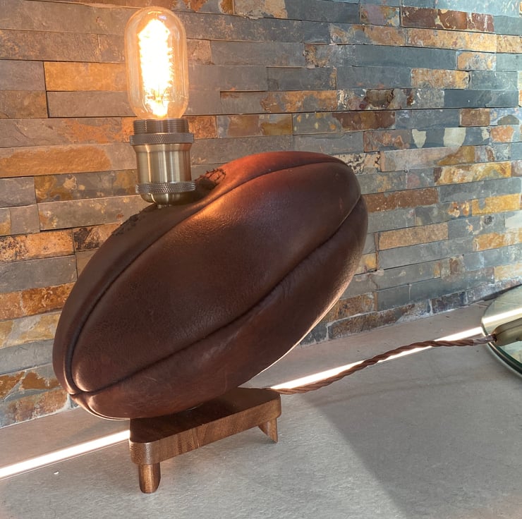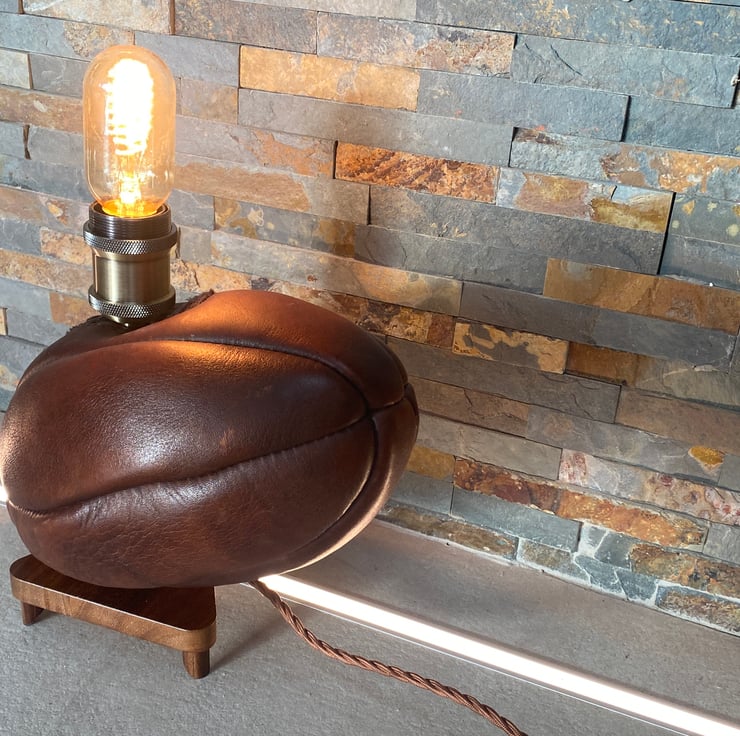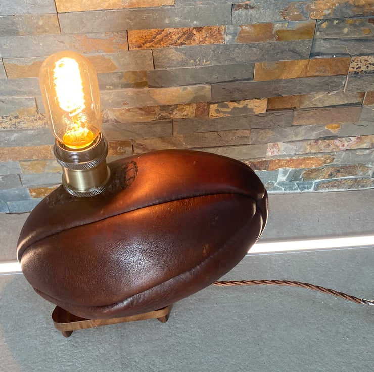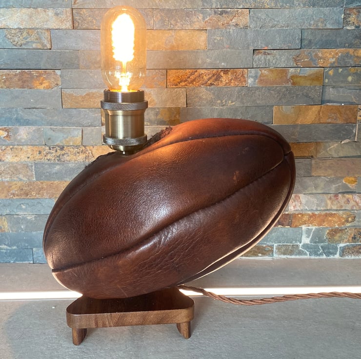 Made by myself using a vintage leather Rugby ball that was bought from a collection of props. I have lightly cleaned the leather ball and mounted on a new ball display plinth. New vintage style gold twist wiring approx 1.5m with a Bakelite style 3amp plug. New vintage style lamp holder with Edison E27 screw bulb fitting (bulb not included) the choice is vast.