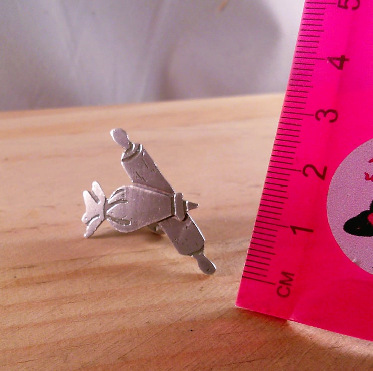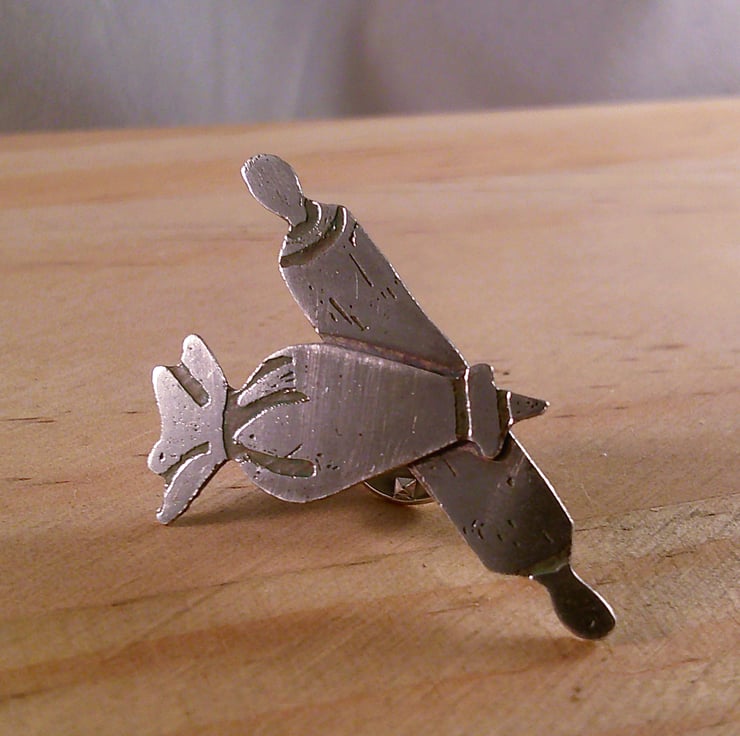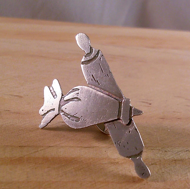 The shape of the rolling pin and icing bag has been hand pierced from a sheet of 100% recycled sterling silver. The details have then been hand drawn and etched. A sterling silver pin has been soldered to the back and the brooch has been oxidised to blacken the etched details. A pin back has also been added.